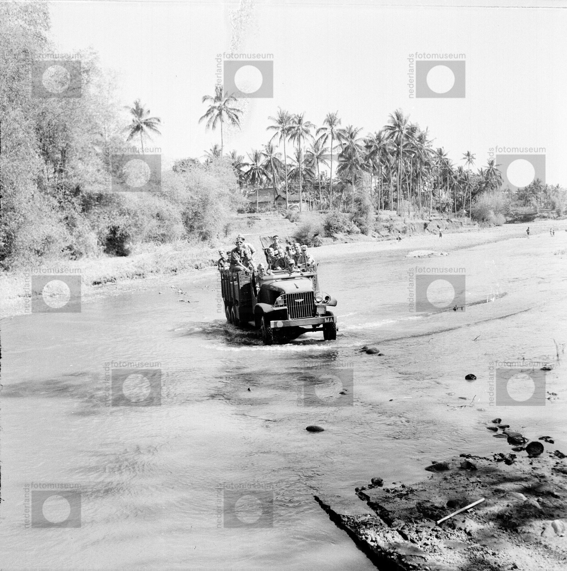 Konvooi van Nederlandse militairen door kali (beek),...