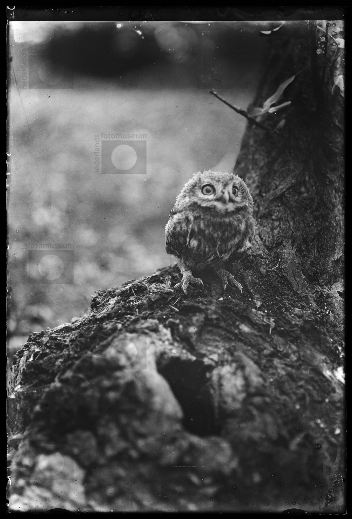 Geringde jonge Steenuil bij nestholte, Bentveld (1922)