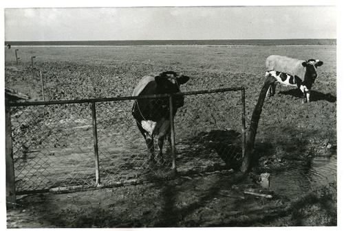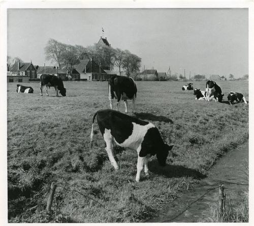 Foto in zwart-wit van een weiland met koeien bij Mil...
