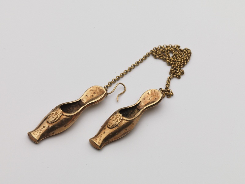 Paar breidoppen in de vorm van gouden muiltjes, verb...