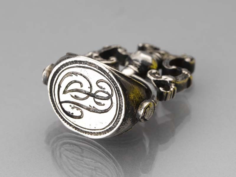 Zegelstempel met spiegelmonogram MVL en zandstrooier...