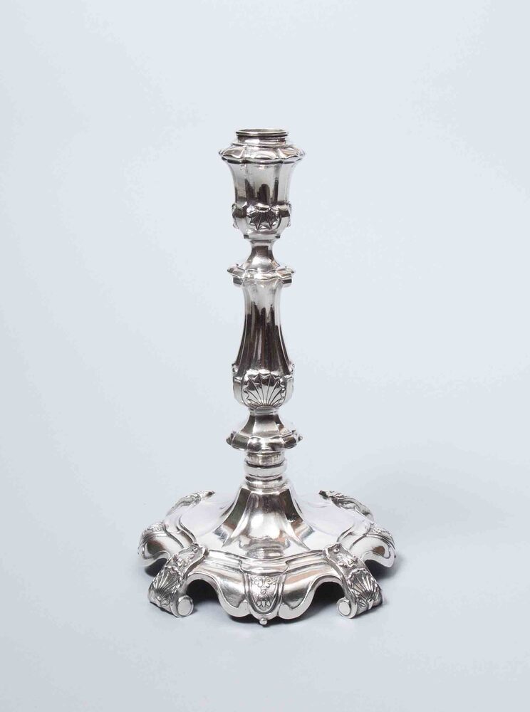 Een van twee zilveren kandelaars versierd met culots...
