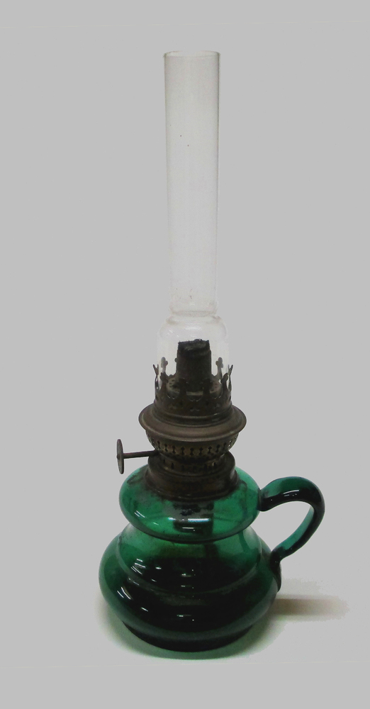 Olielamp met pijpvormigglas op messinghouder en bran...