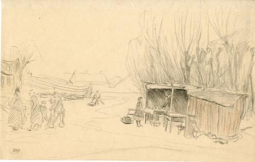 Tekening met potlood van een winters tafereel aan he...