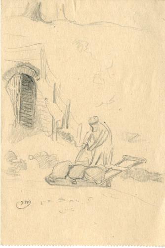 Tekening met potlood van een man die zakken op een s...