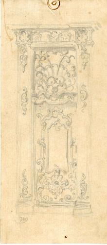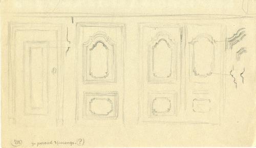 Tekening met potlood van een deur en drie versierde ...