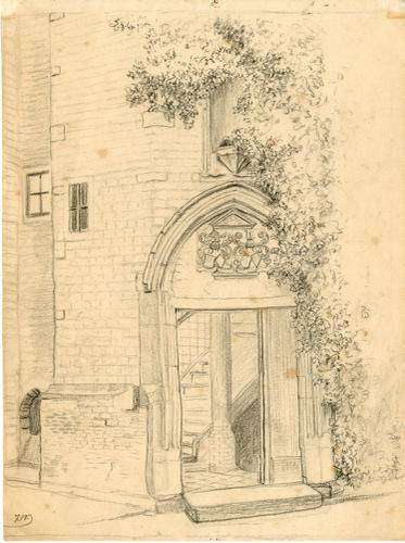 Tekening met potlood van de deur van het Coopmanshûs...