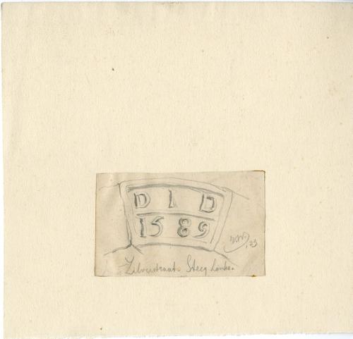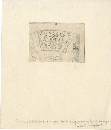 Tekening met potlood van een gevelsteen boven een st...