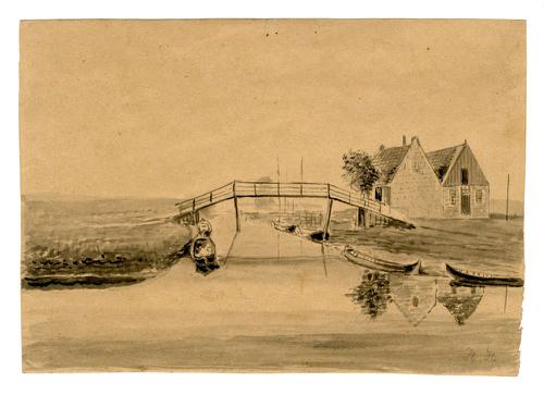 Een lithografie van het Vliet en de Vlietsterbrug in...