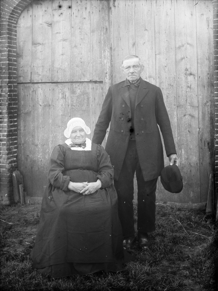 Een ouder boerenechtpaar, zij zittend, hij staand, b...