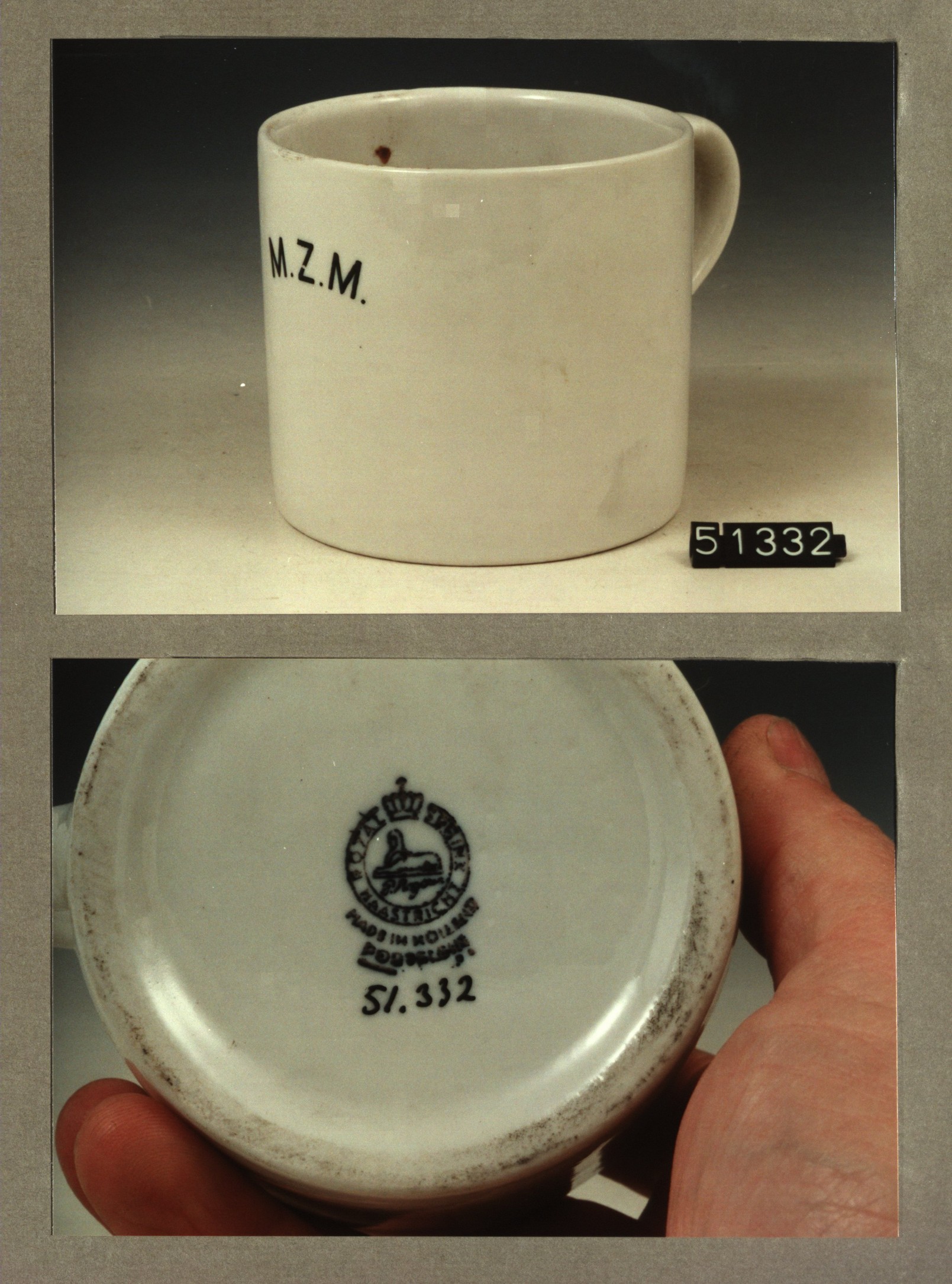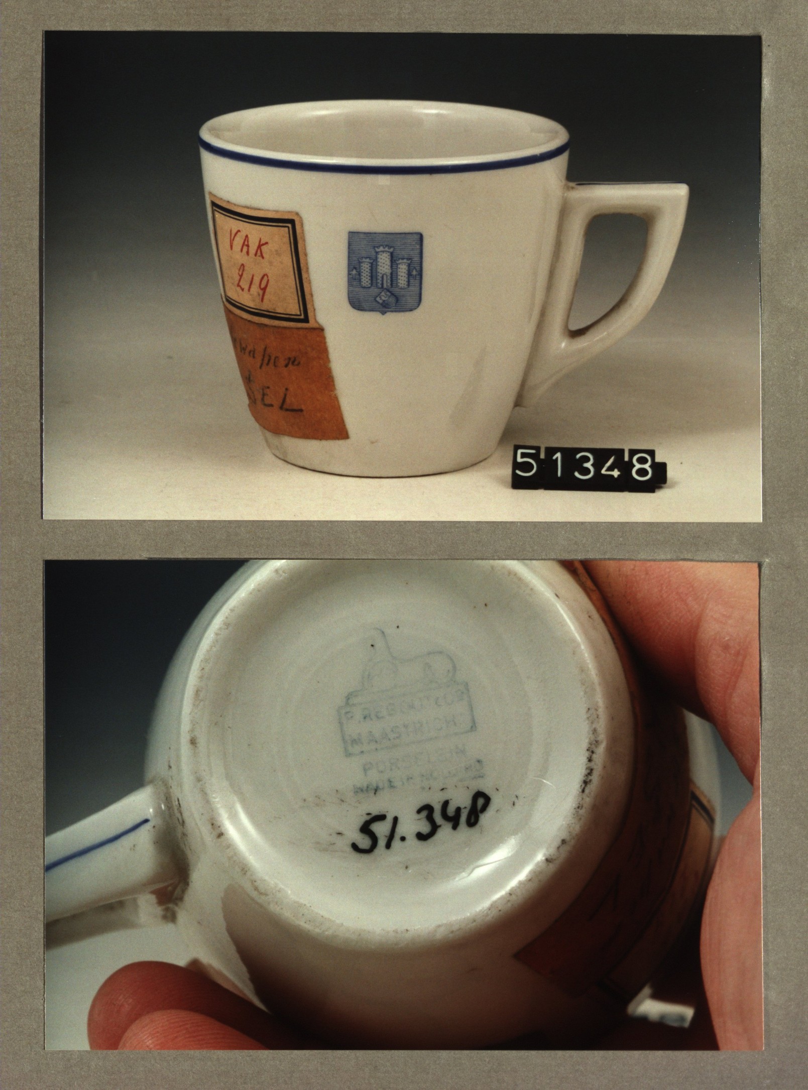 Mok met opschrift, model No3 met decor Maastrichtse ...