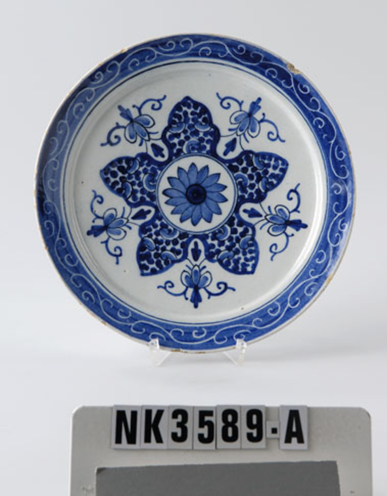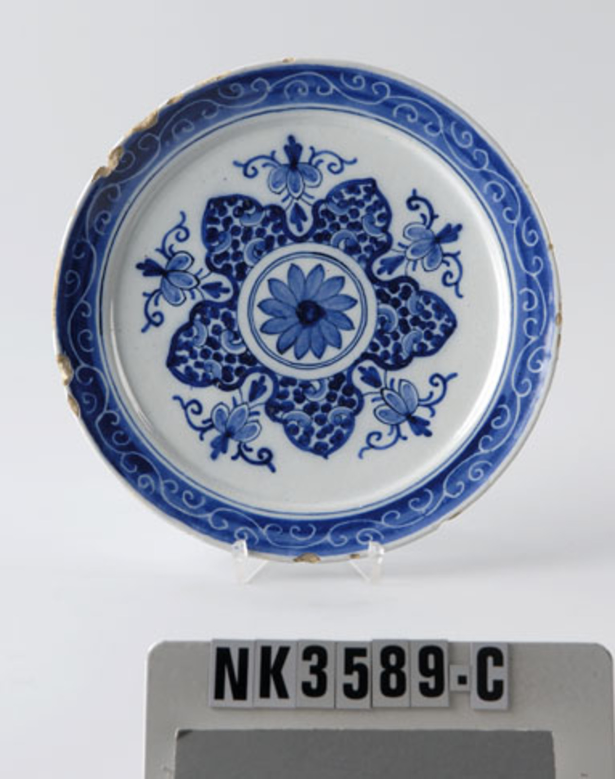 Pannenkoek, faïence met blauwwit decor van plantenbl...