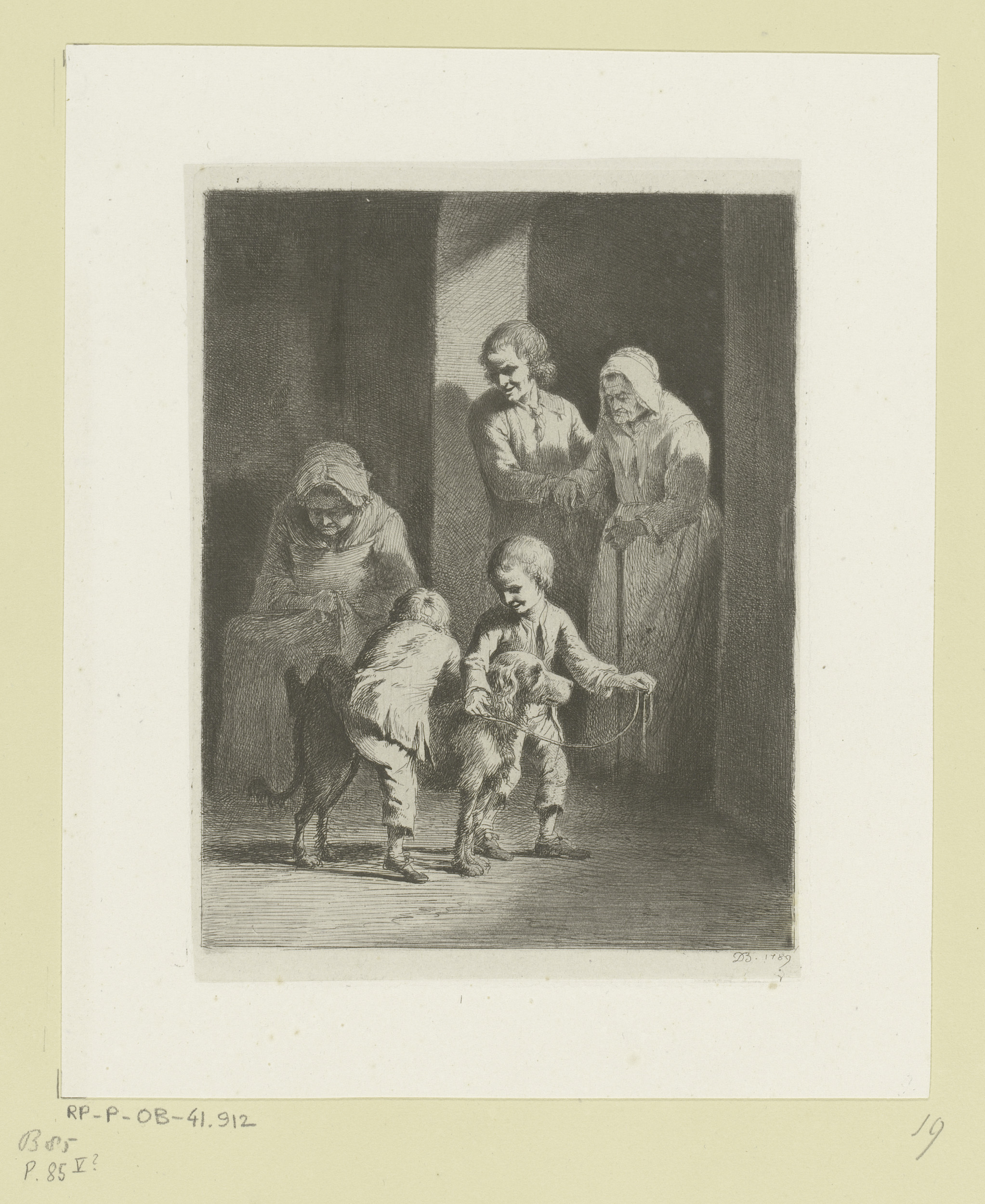Kinderen met hond spelend, achter hen twee oude vrou...