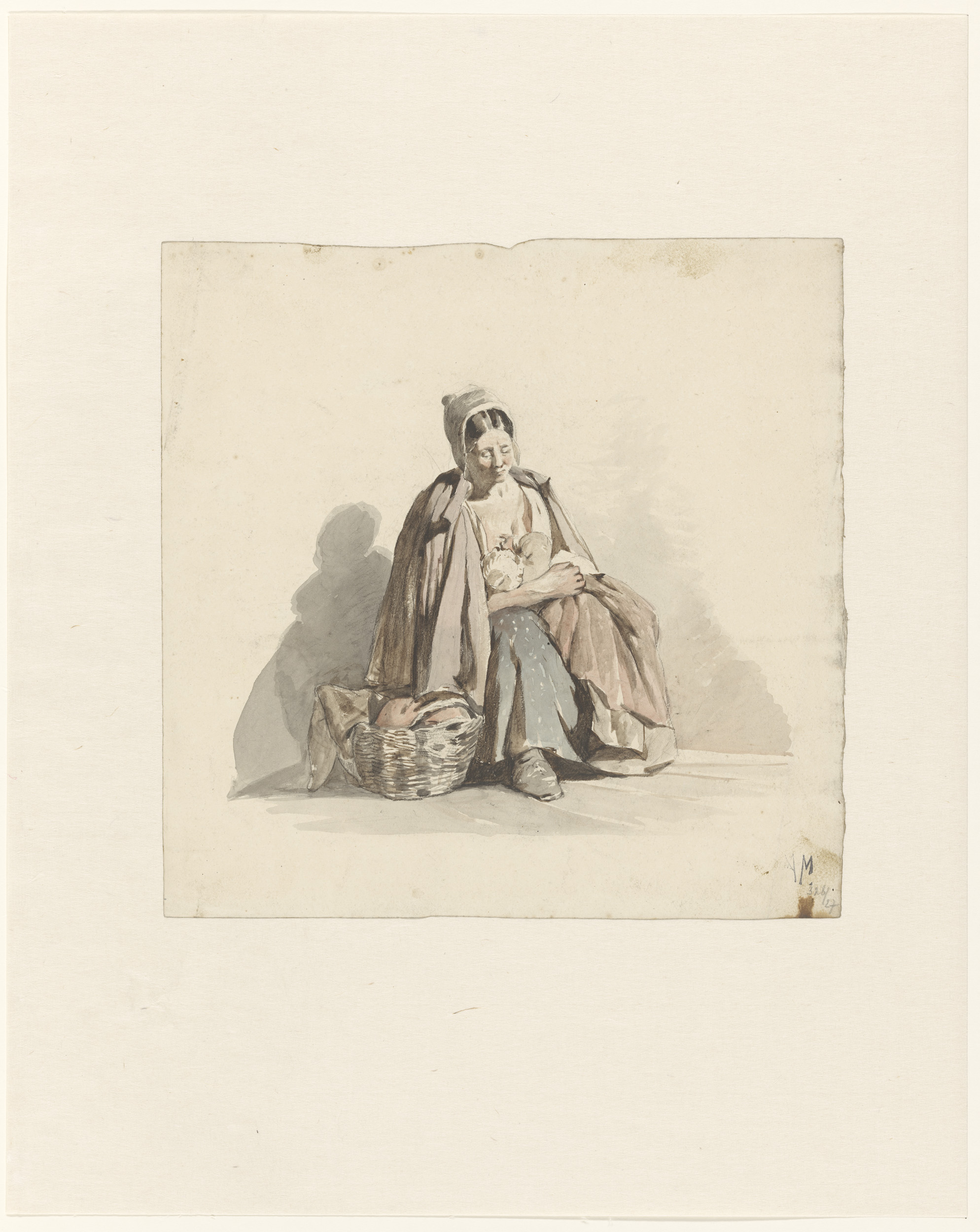 Zittende vrouw met een kind aan de borst