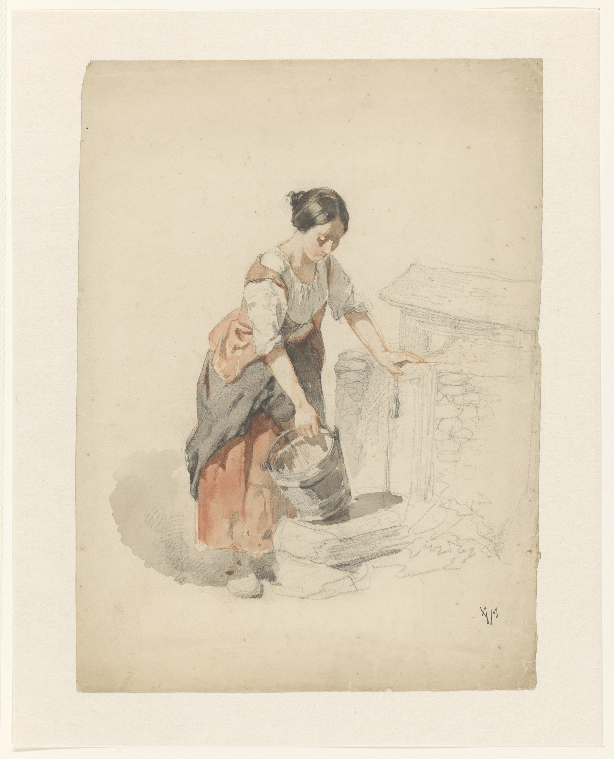 Jonge vrouw die een emmer vult