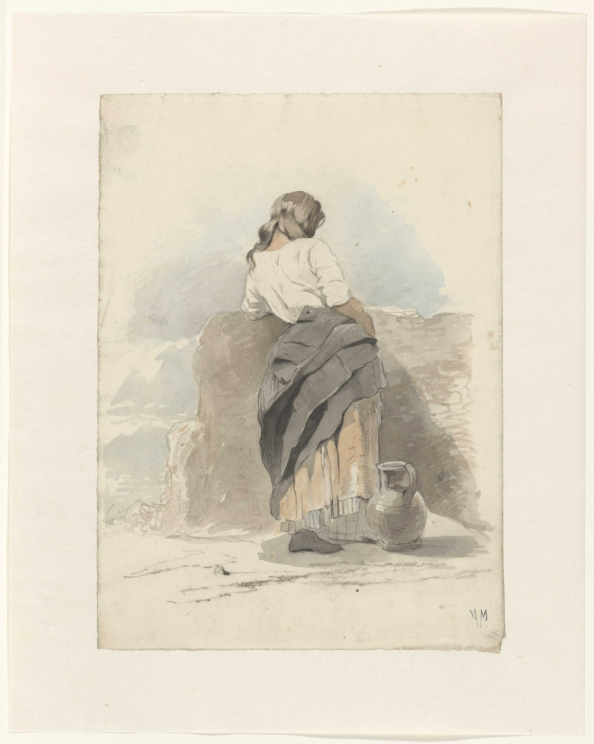 Staande jonge vrouw bij een muur, op de rug gezien
