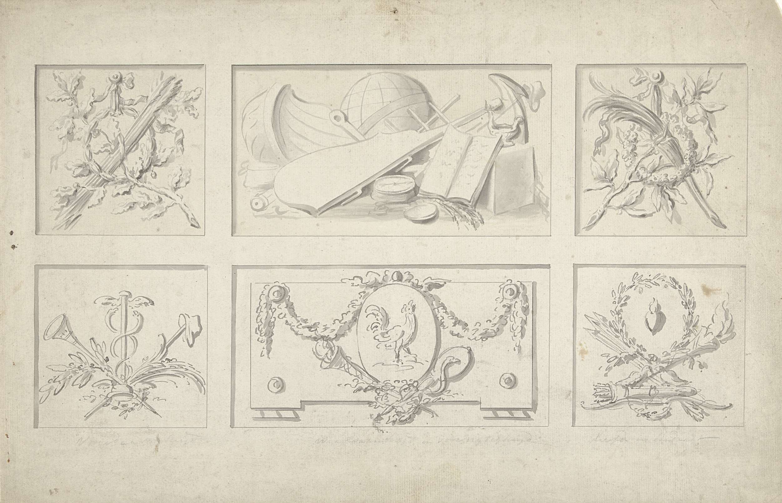 Zes ontwerpen voor paneelvullingen met attributen va...