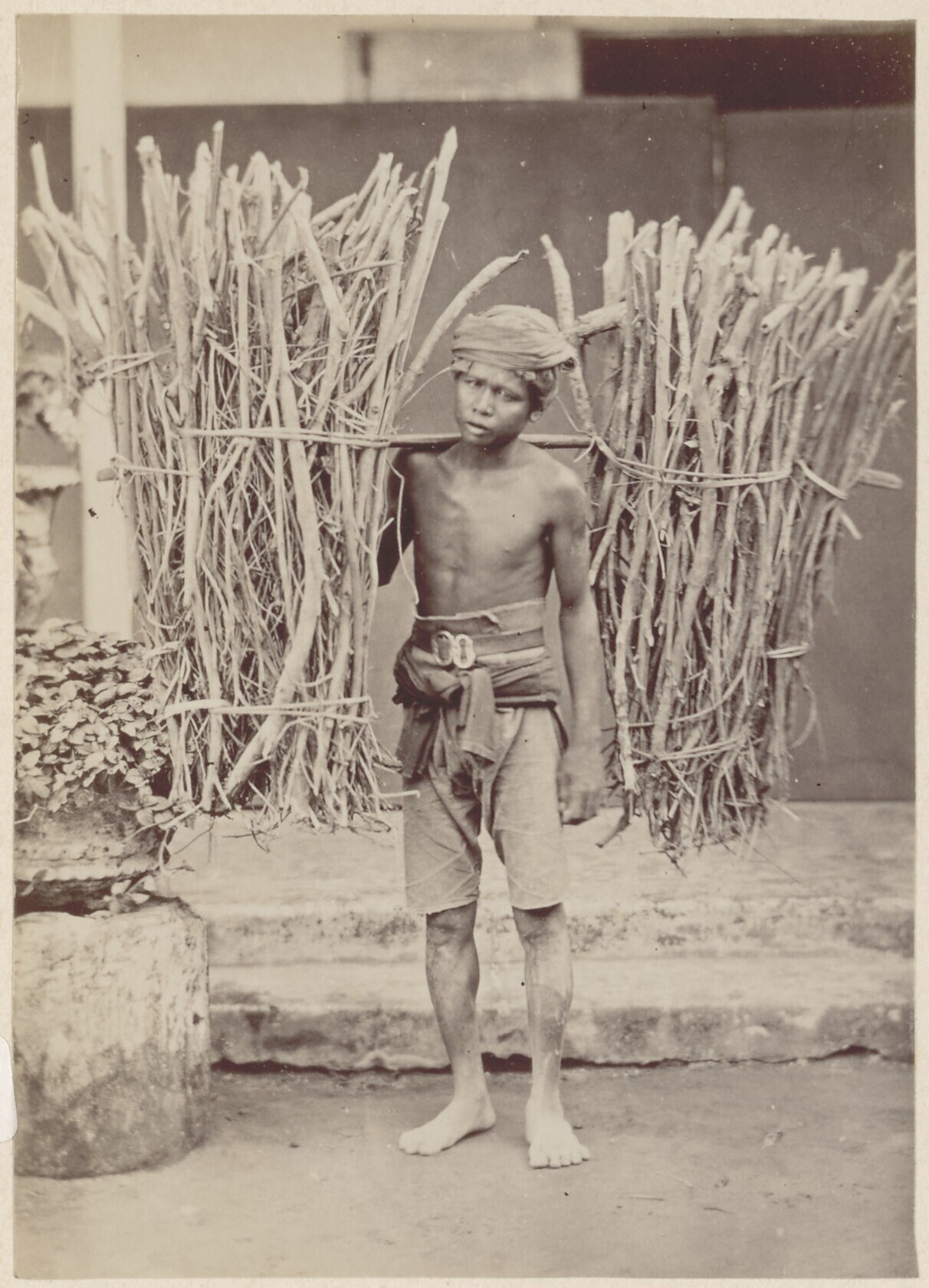 Portret van een Javaanse houthakker met een draagsto...
