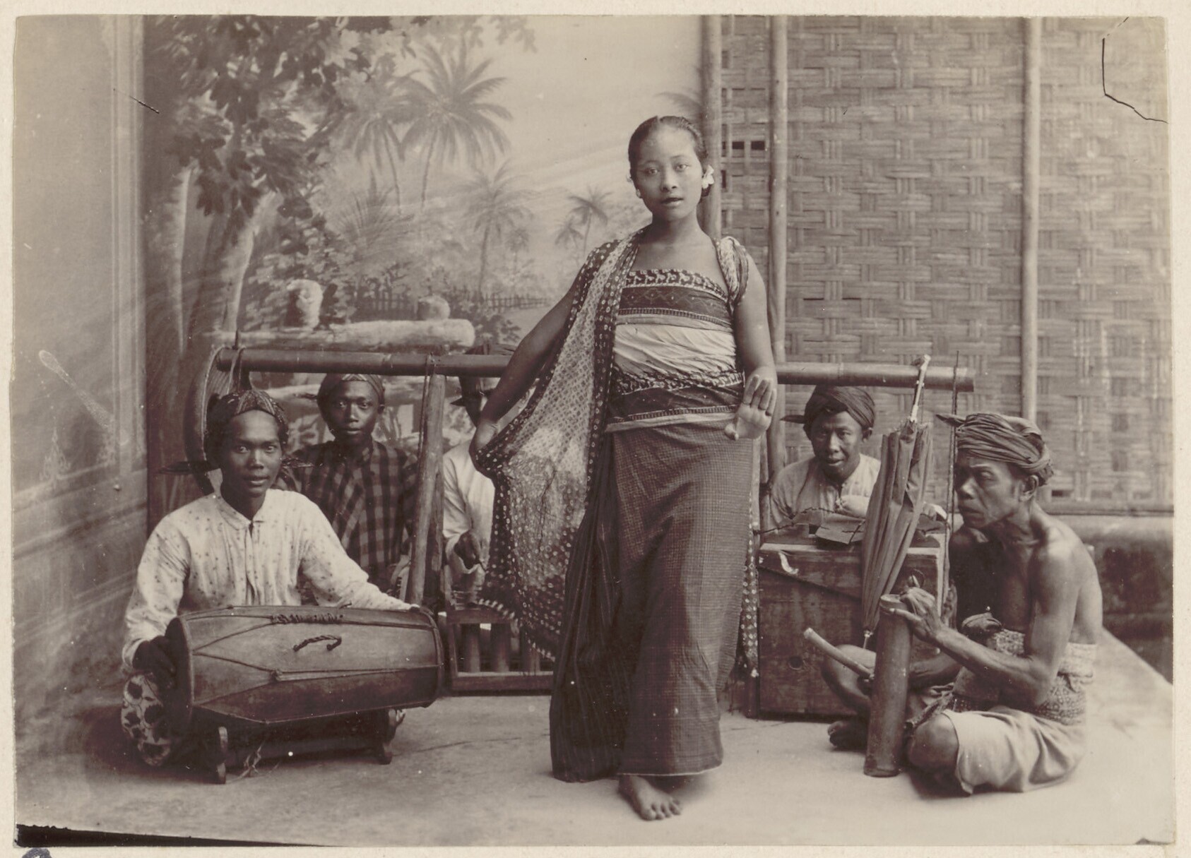Studioportret van een ronggeng danseres met muzikanten