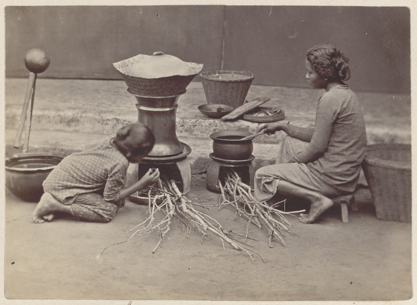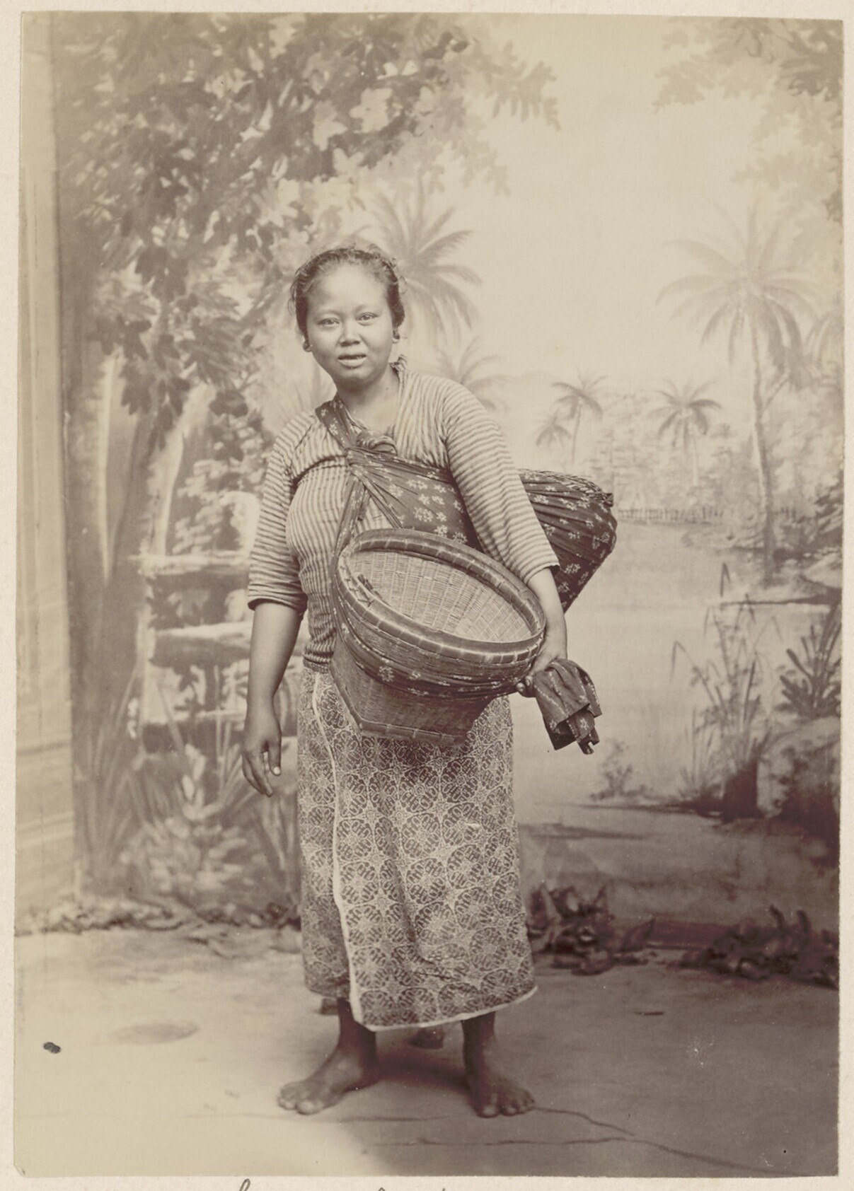 Studioportret van een Javaanse keukenmeid op weg naa...