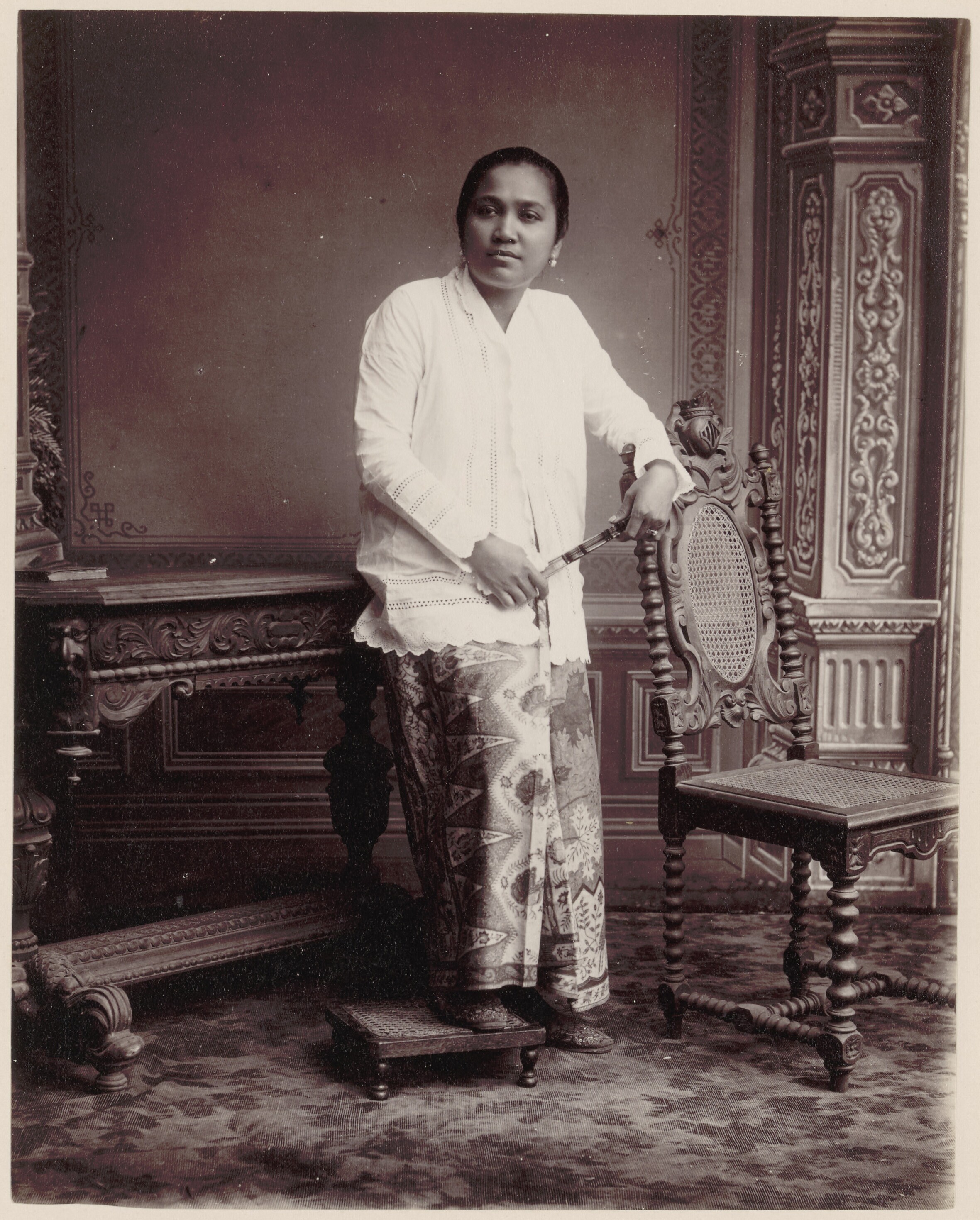 Studioportret van een vrouw uit Batavia in sarong en...