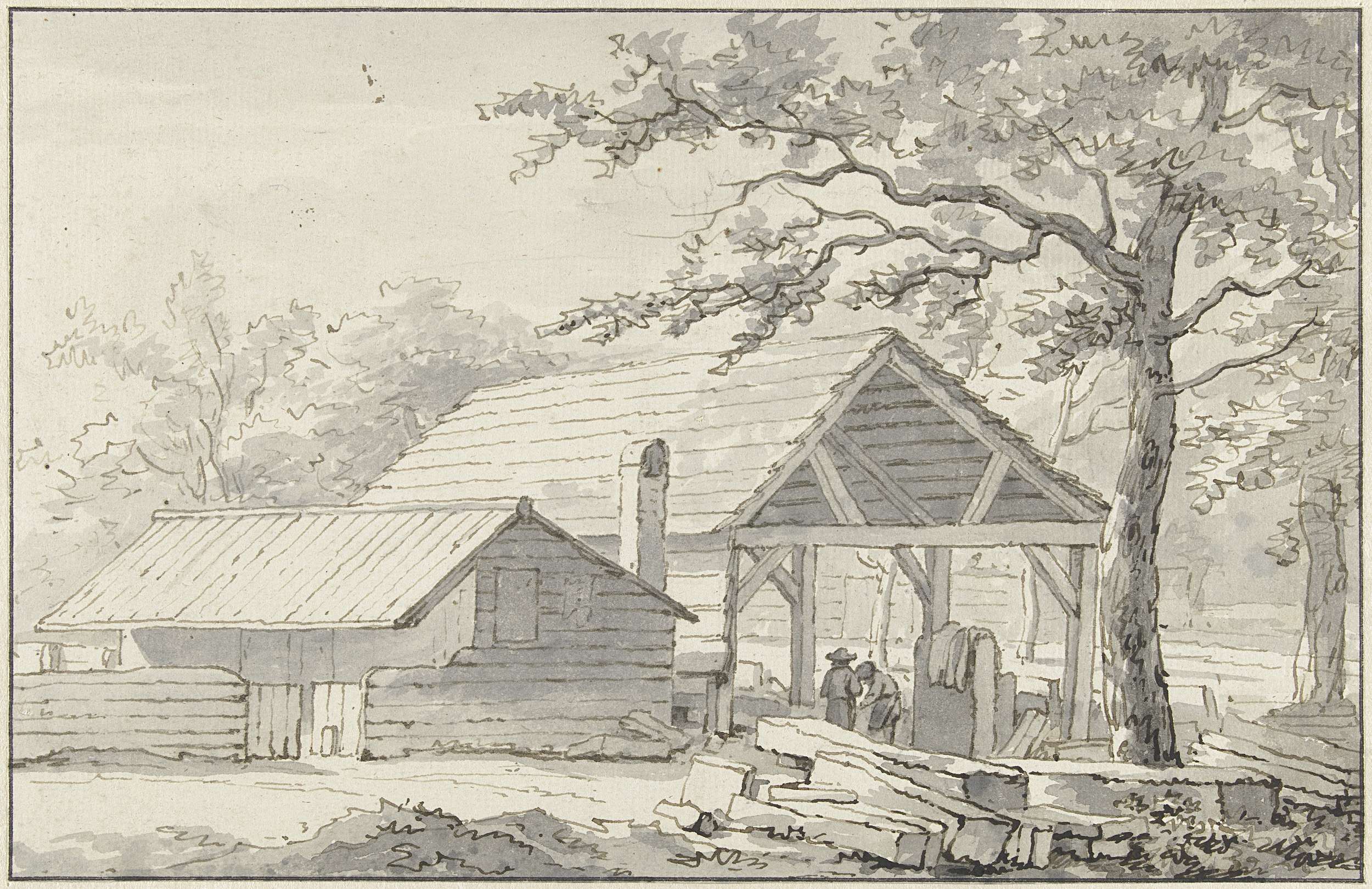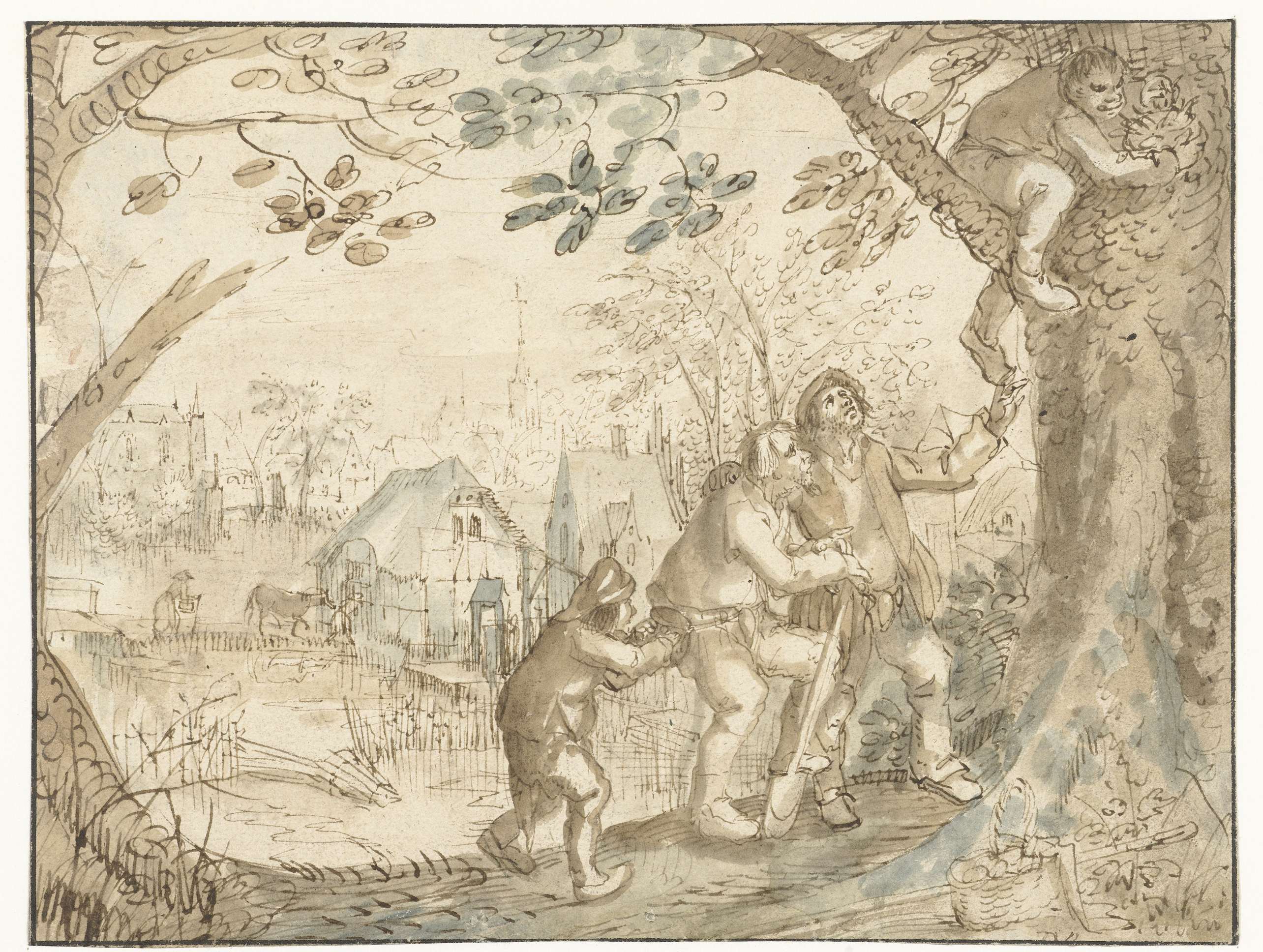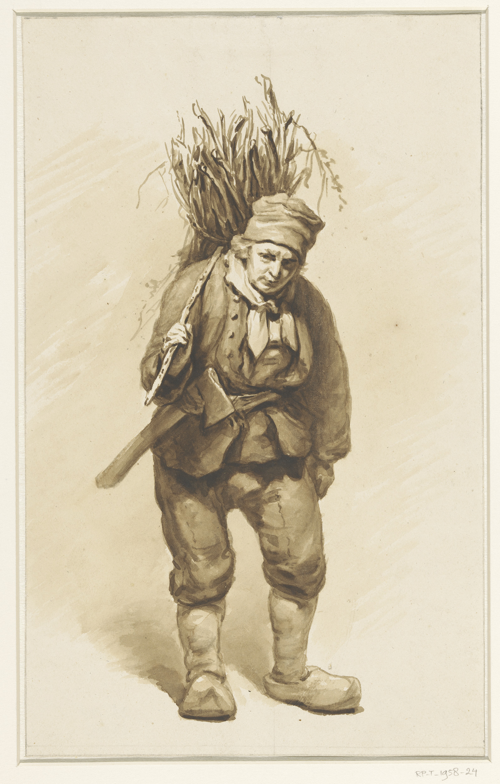 Houthakker met een takkenbos over de schouder en een...