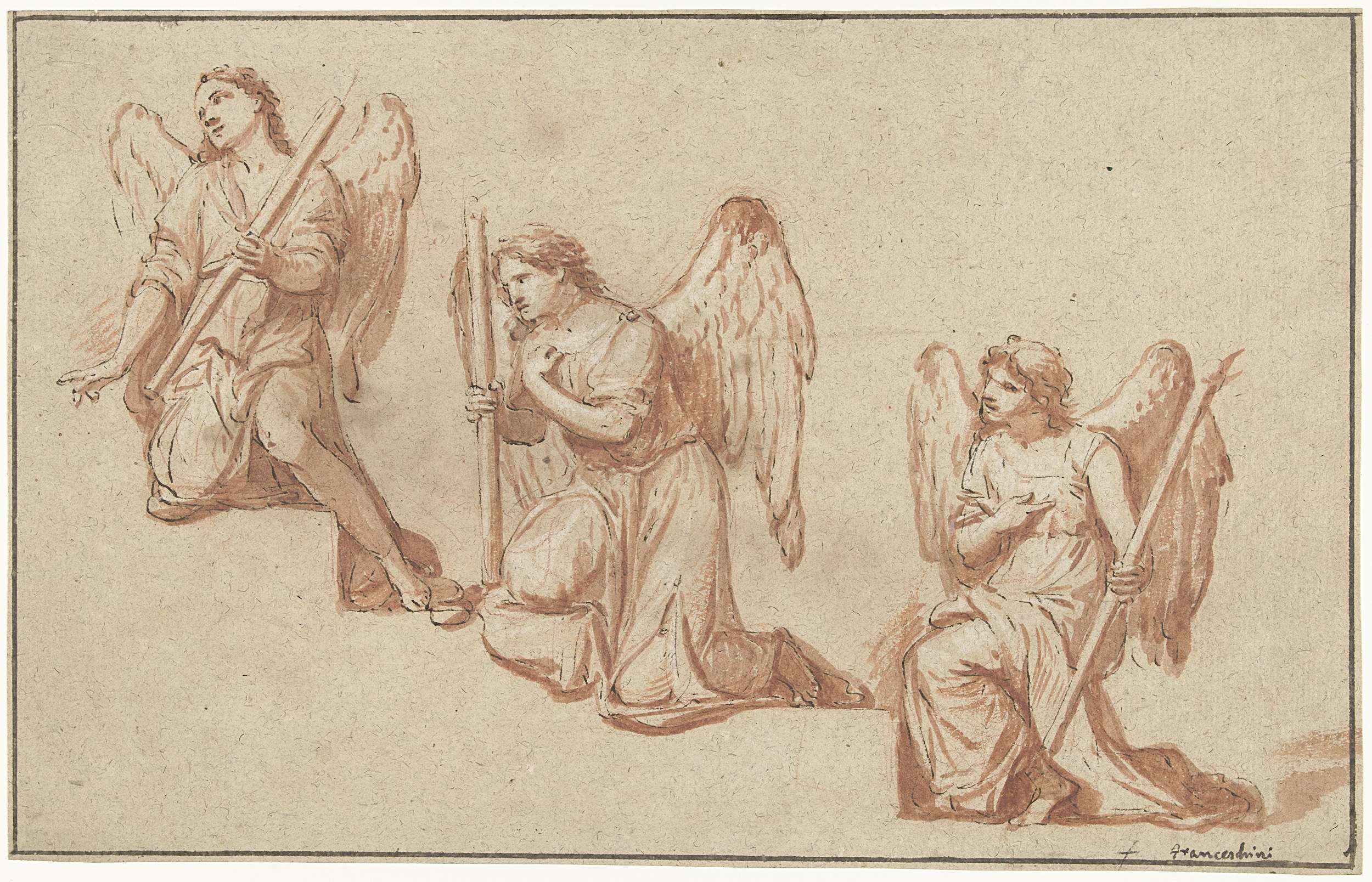 Drie studies van knielende engelen met een toorts