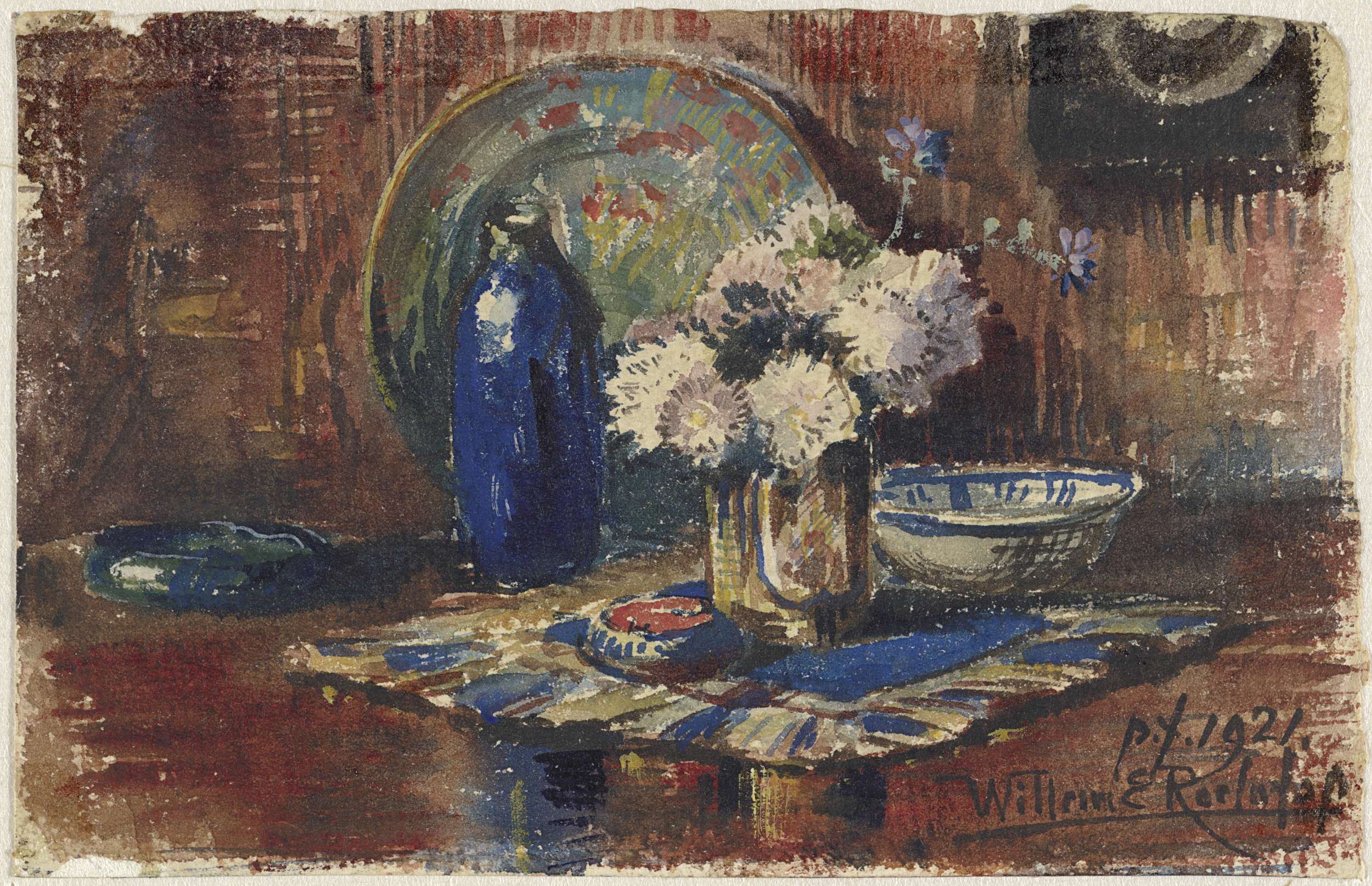 Stilleven met blauwe fles en vaas met bloemen