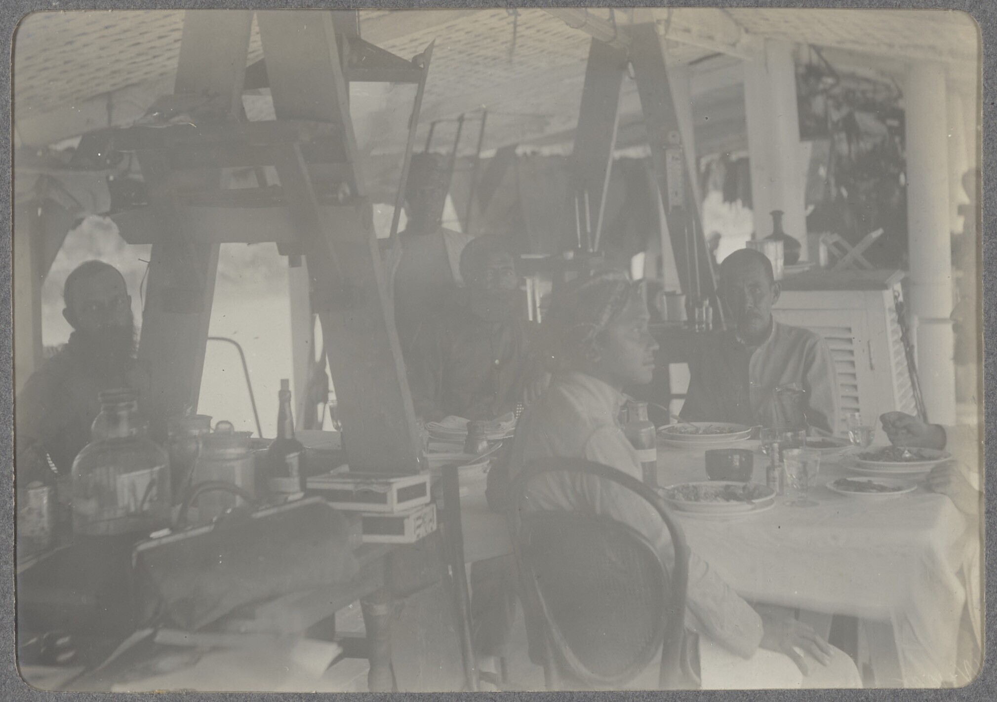 Expeditieleden tijdens een maaltijd aan boord van de...