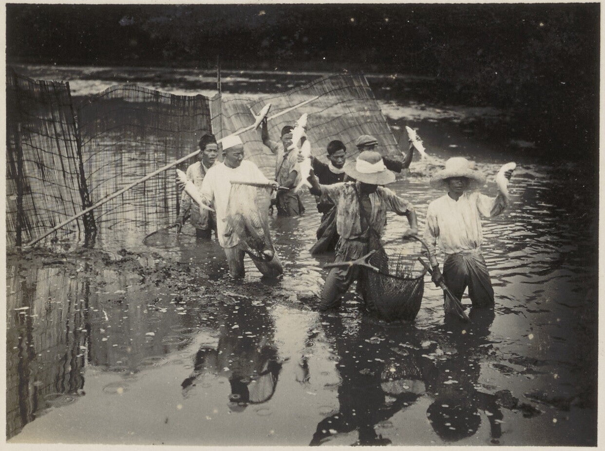 Mannen tonen 'bandeng', vis die gekweekt wordt in vi...