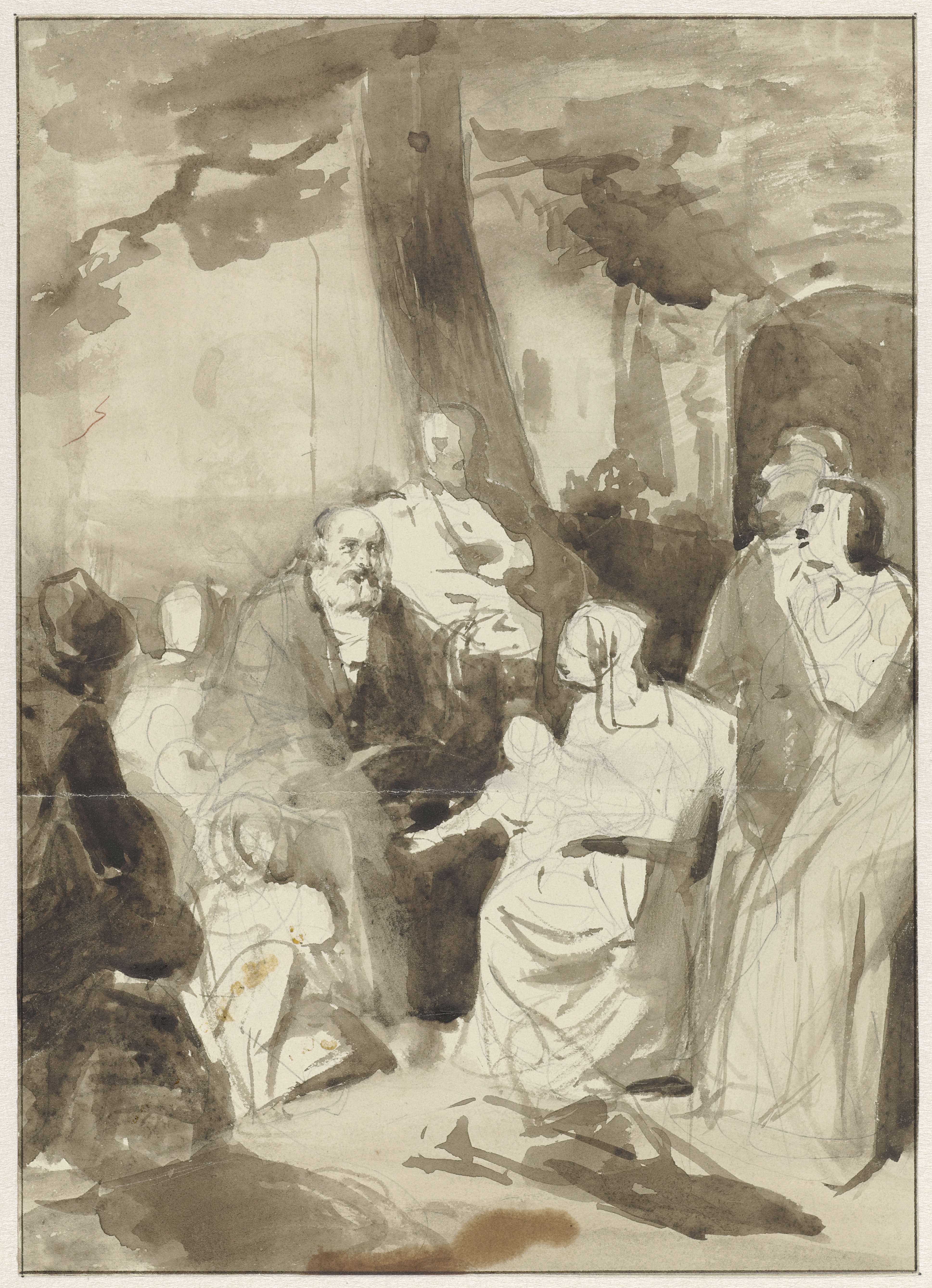 Gezelschap rondom een zittende grijsaard
