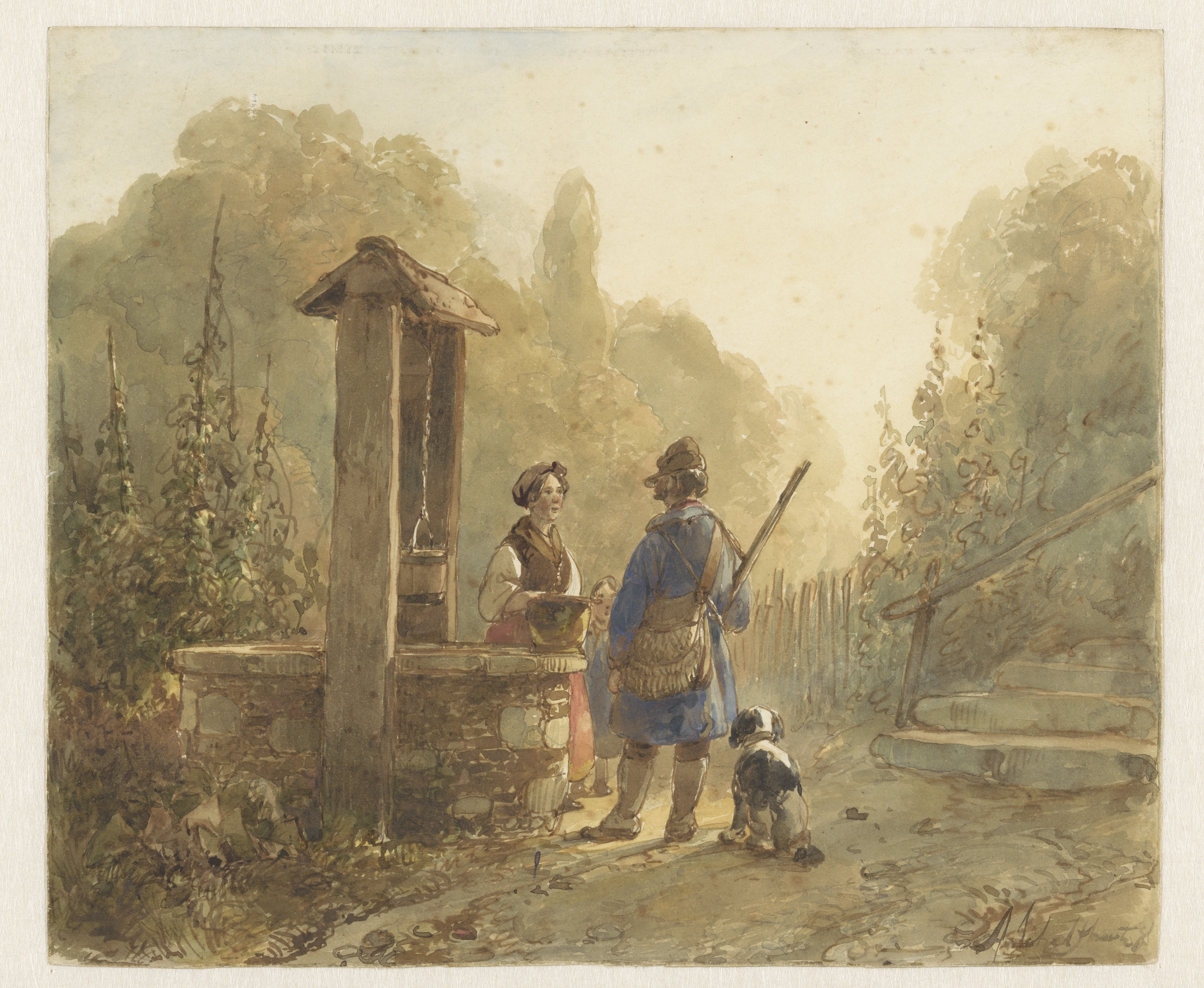 Jager in gesprek met een boerin bij een waterput, na...