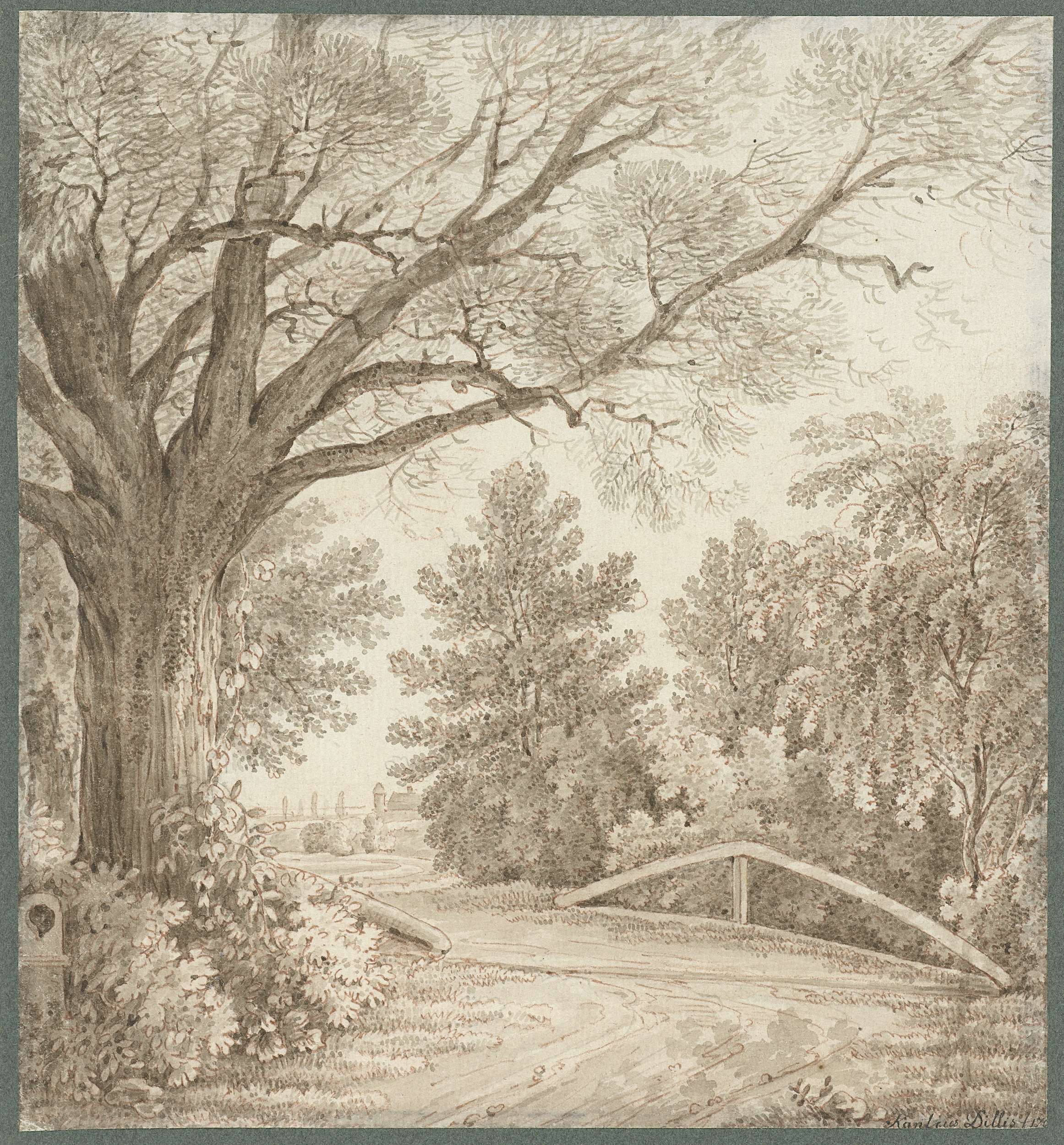 Landweg over eenvoudige brug bij zware boom