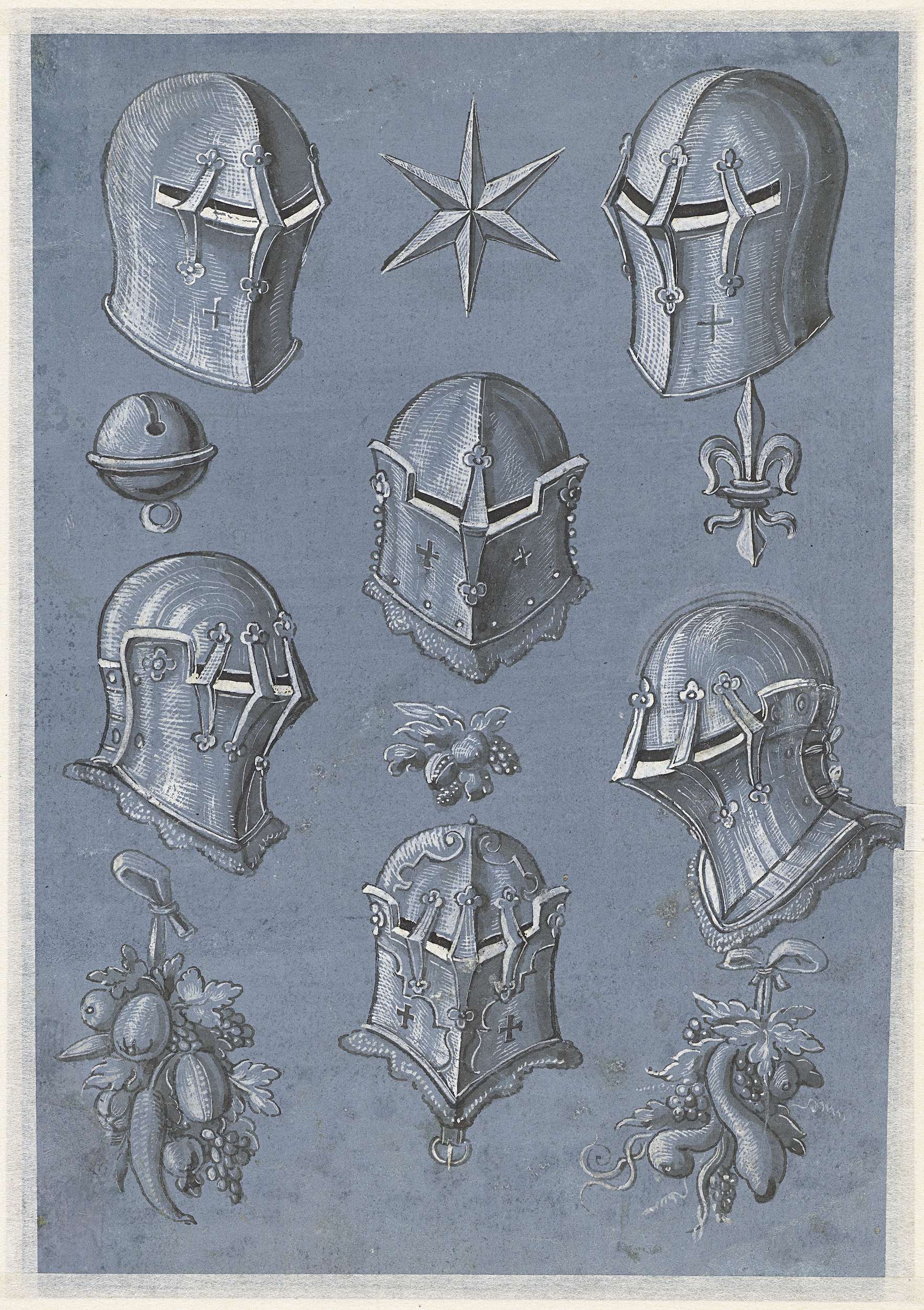 Blad met vijf helmen, een kroon, een lauwerkrans en ...