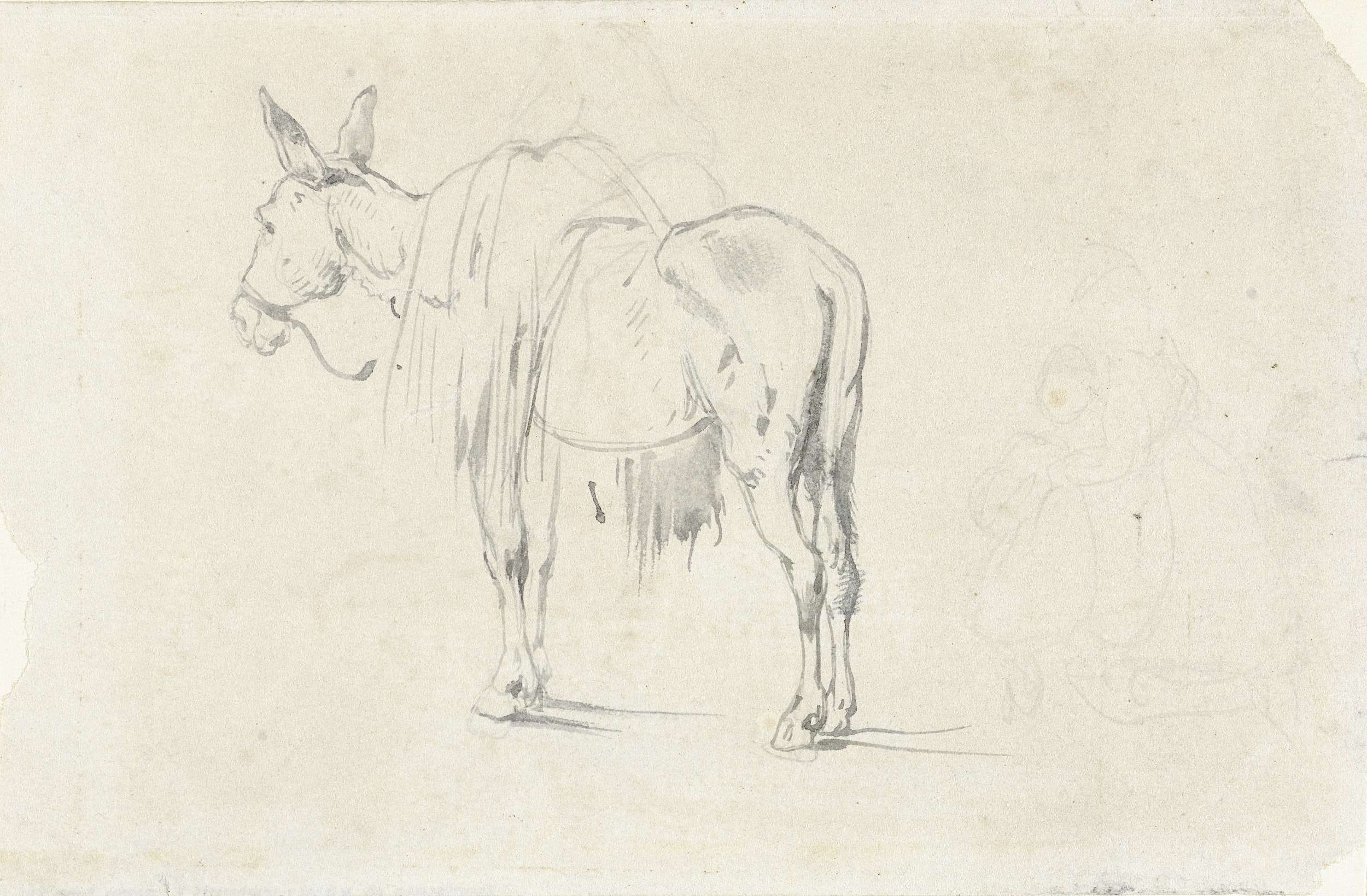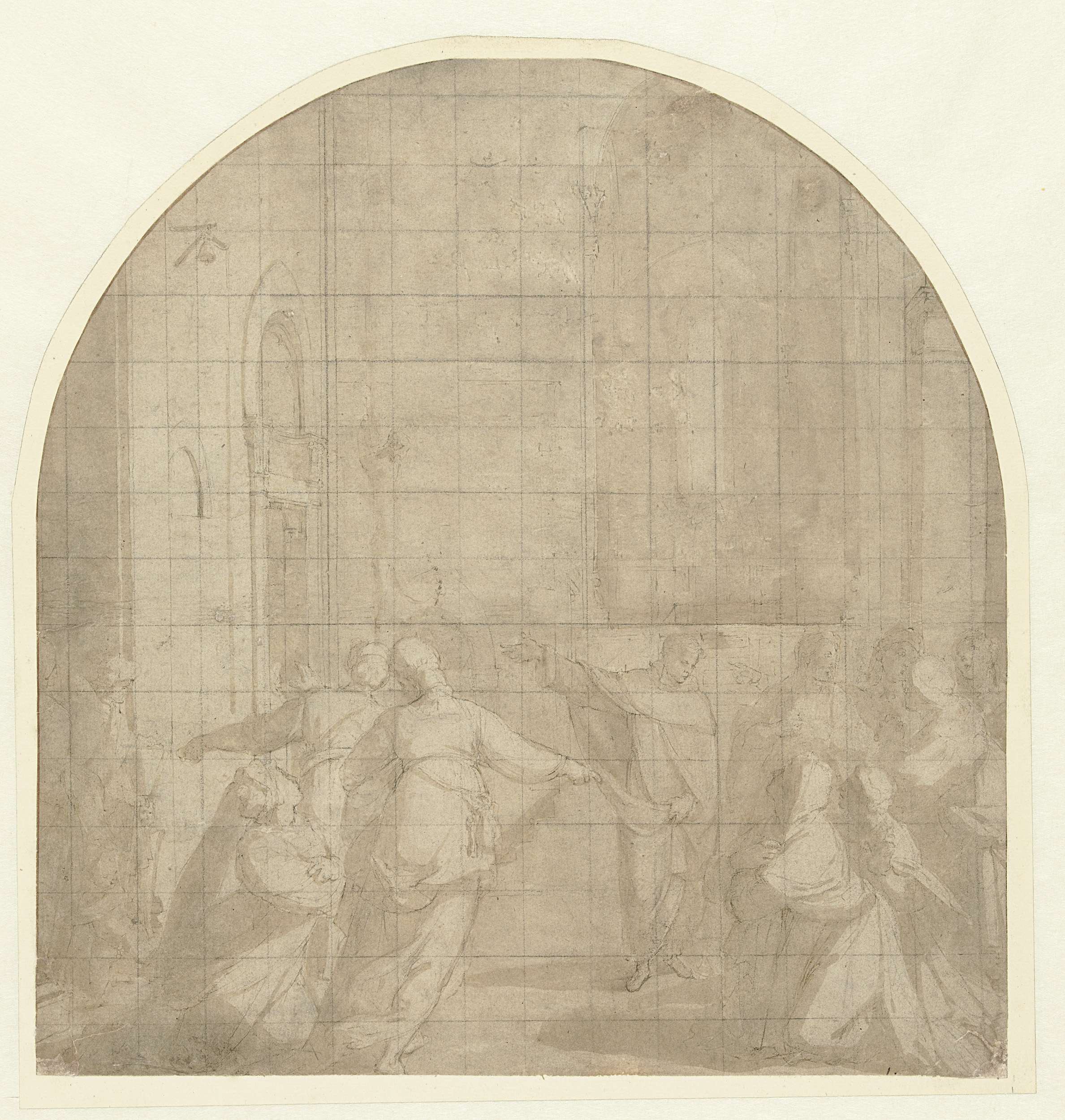 Twee ruiters en een gezelschap te voet bij een muur ...