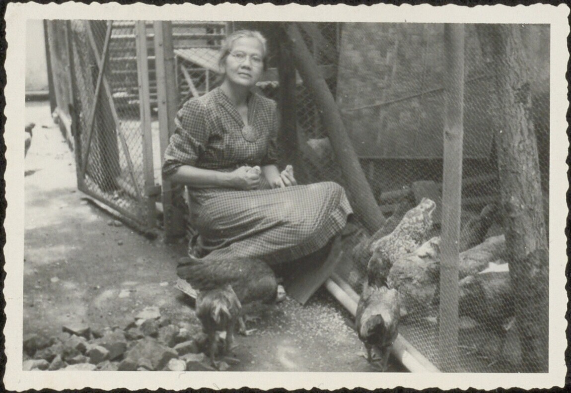 Portret van een vrouw bij een kippenren