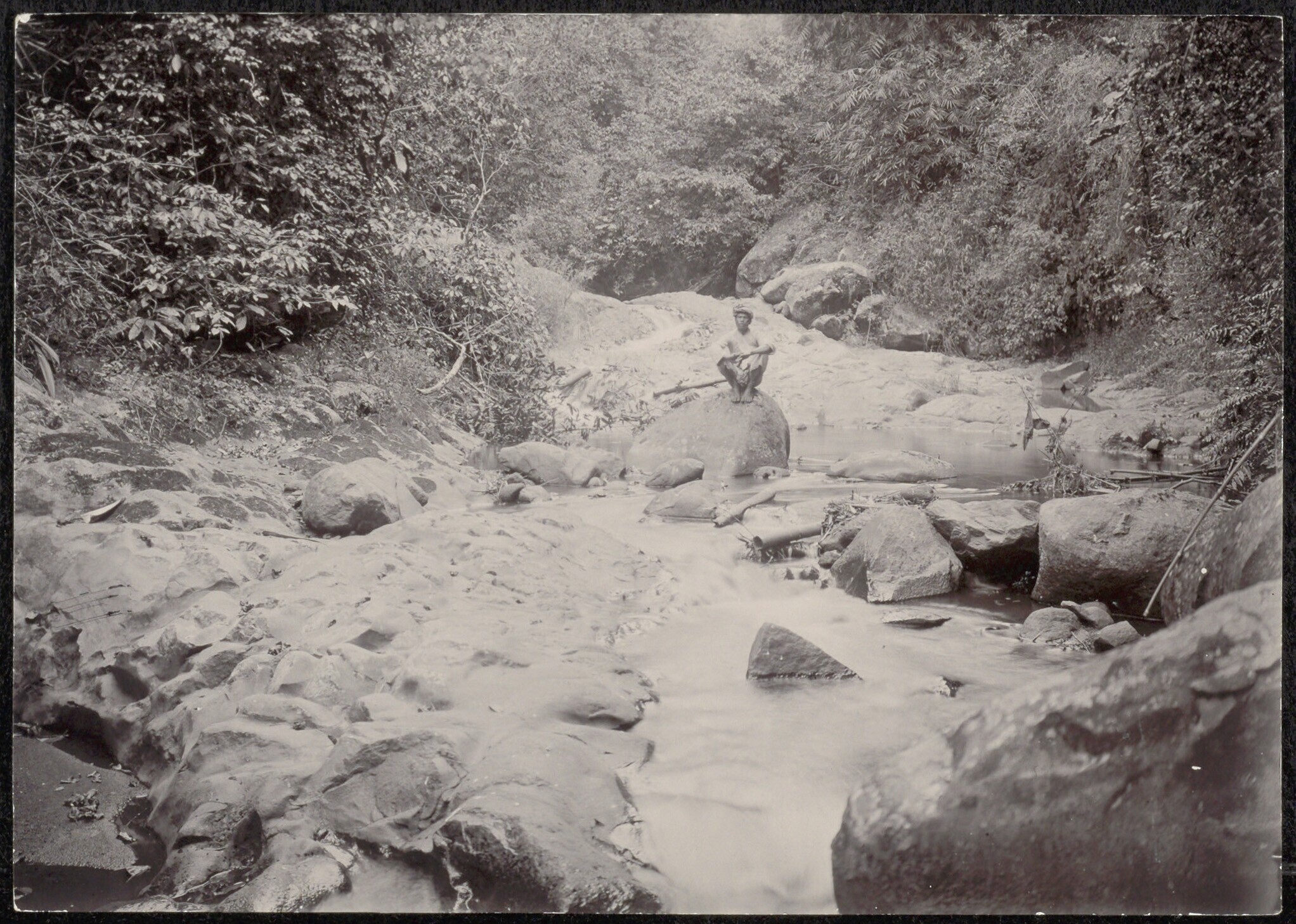 Javaanse man, zittend op een kei in een rivierbedding