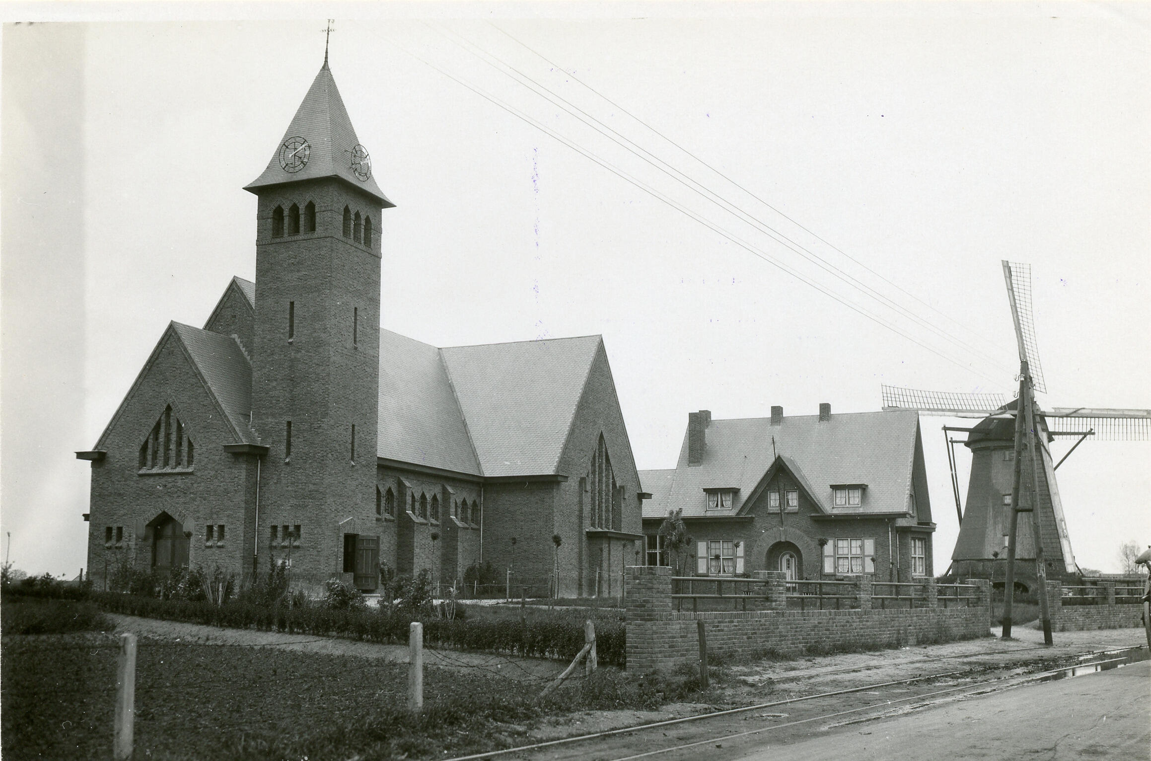 Kerk, pastorie en molen, Beringe, 1930 (zwart-wit foto)