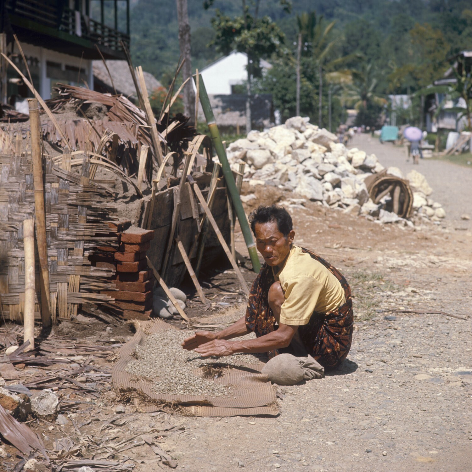 Verkoper langs de hoofdstraat op weg naar de markt, ...