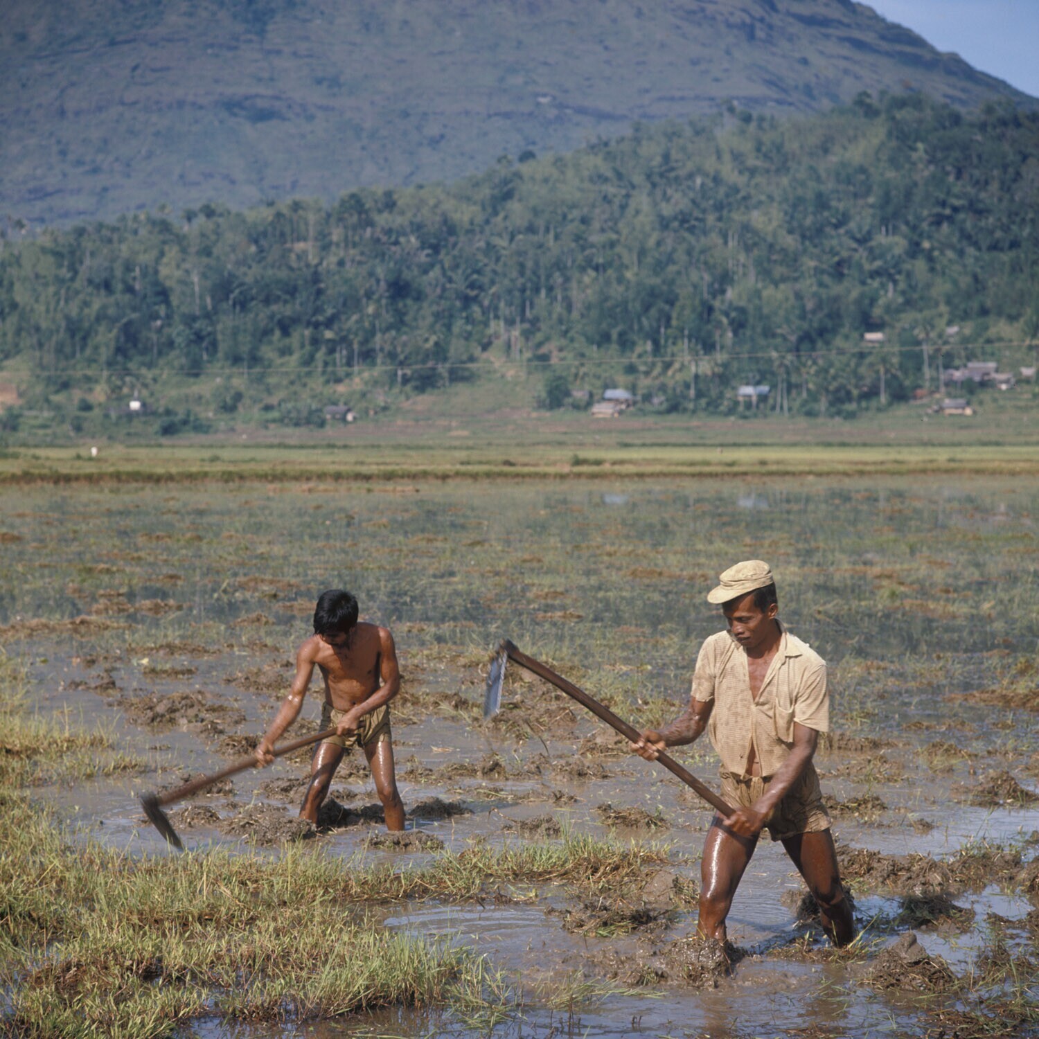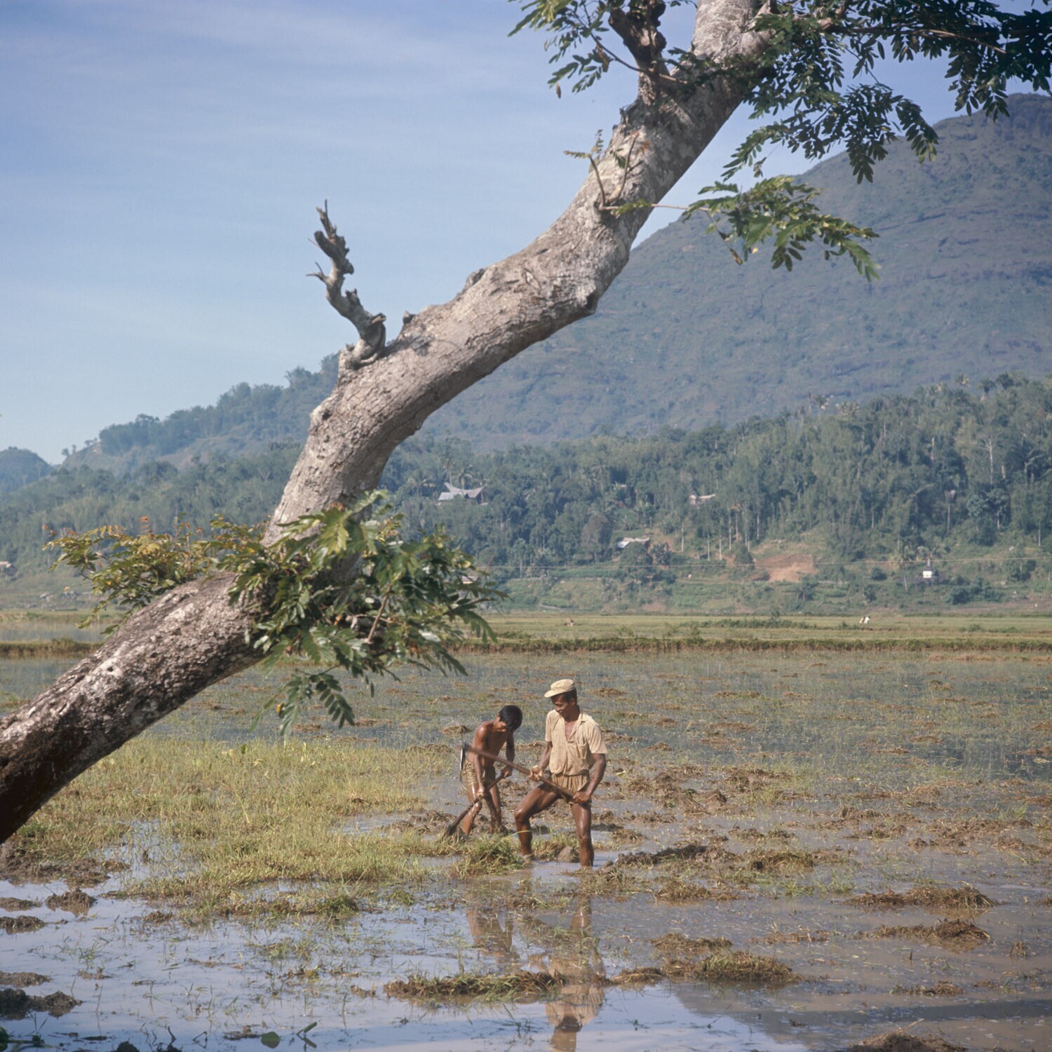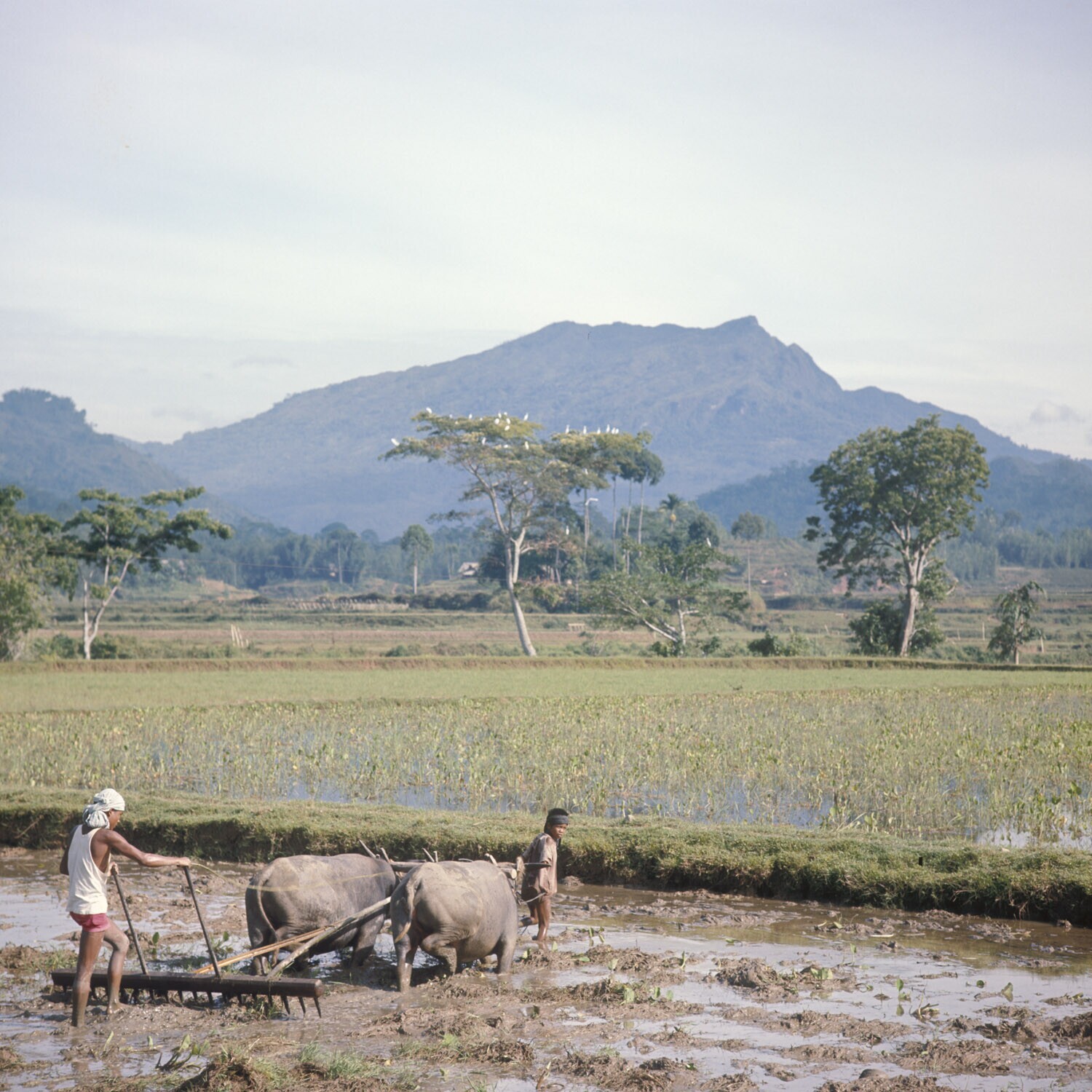 Het eggen van een sawah nabij Markale, Tana Toradja,...