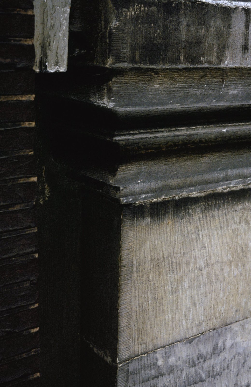 Interieur, gebeeldhouwde kraagsteen onder moerbalk