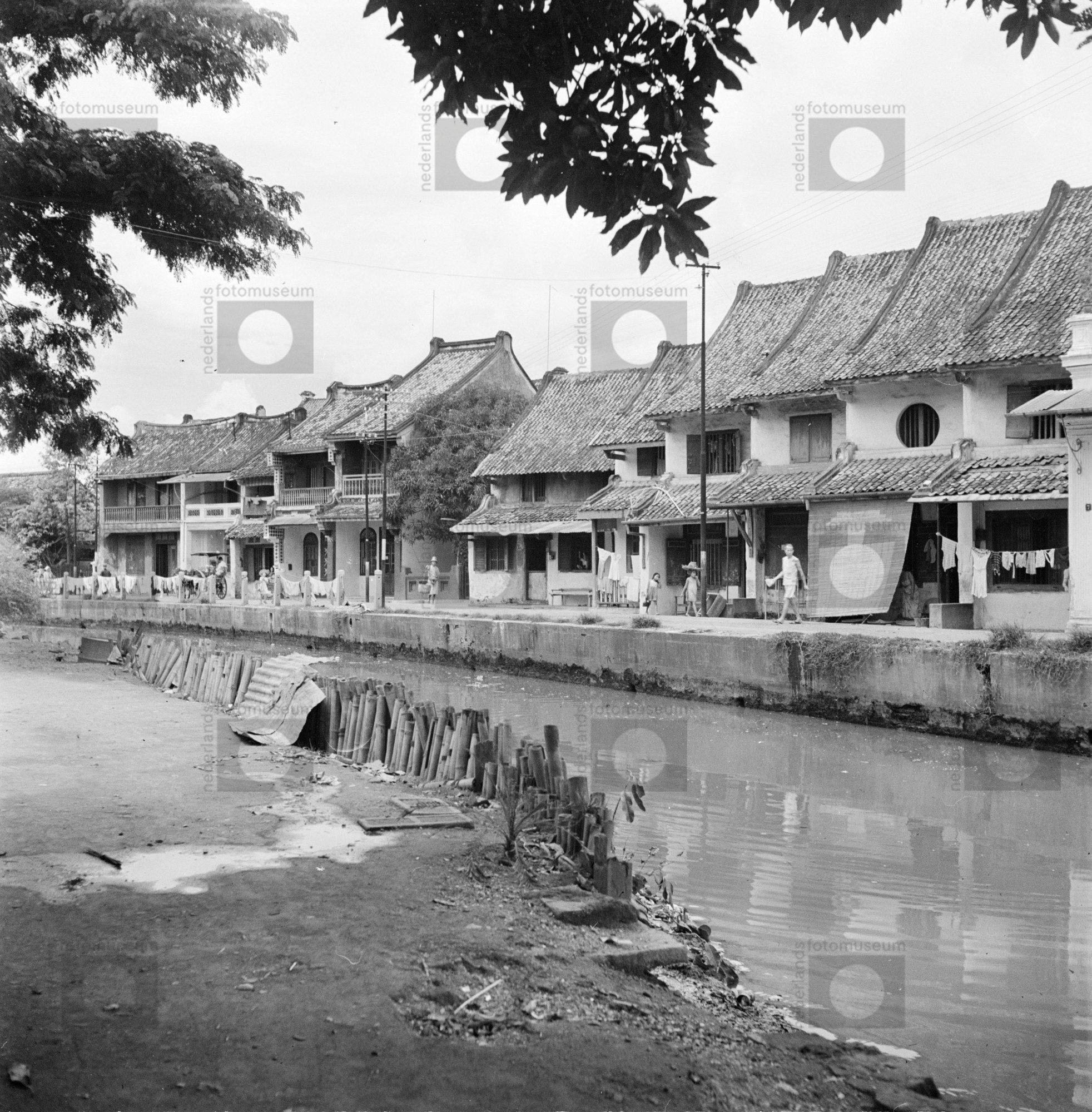 Bebouwing, deels op palen, langs haven van Pontianak...