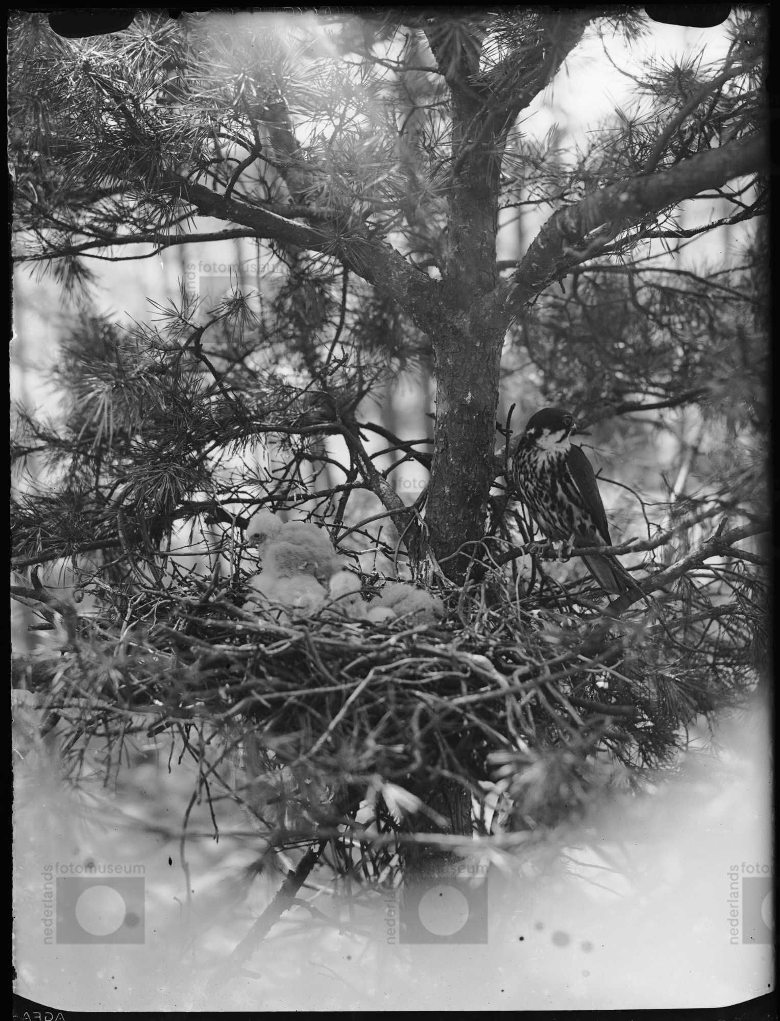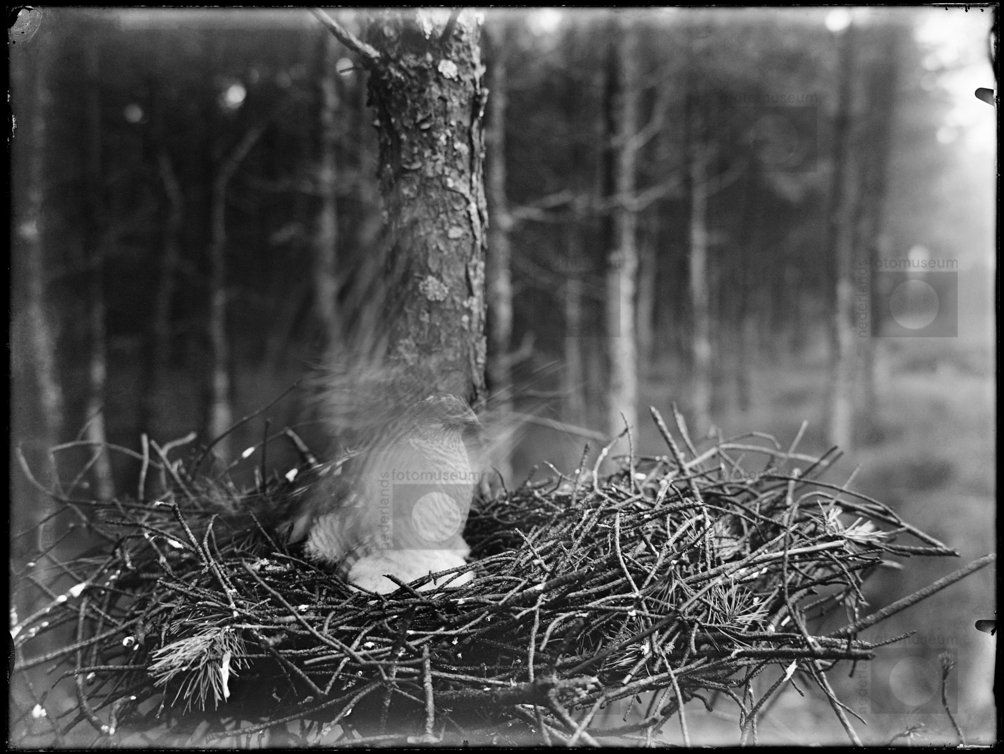 Sperwer op (uit boom gehaald) nest met jongen, [1913?]