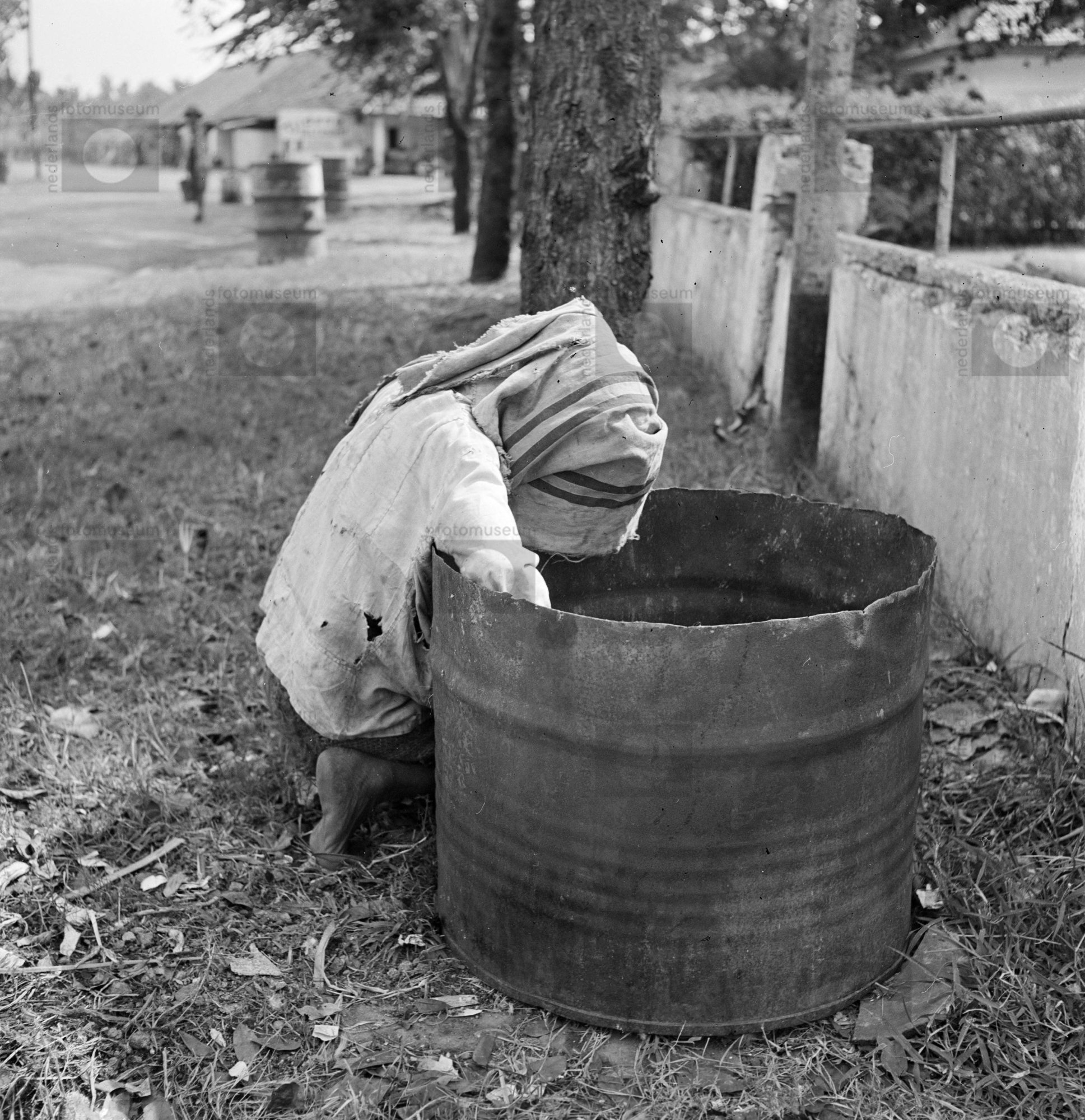 Uitgeputte arme vrouw zoekt in een afvalbak te Jakar...