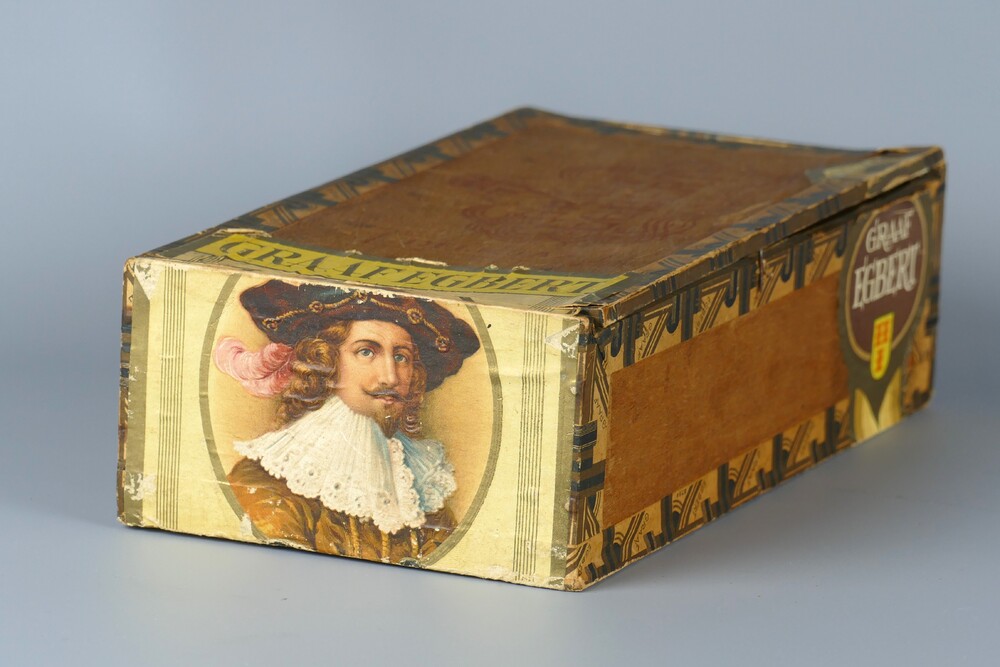 sigarenkist van hout met stempel en etiket Graaf Egb...
