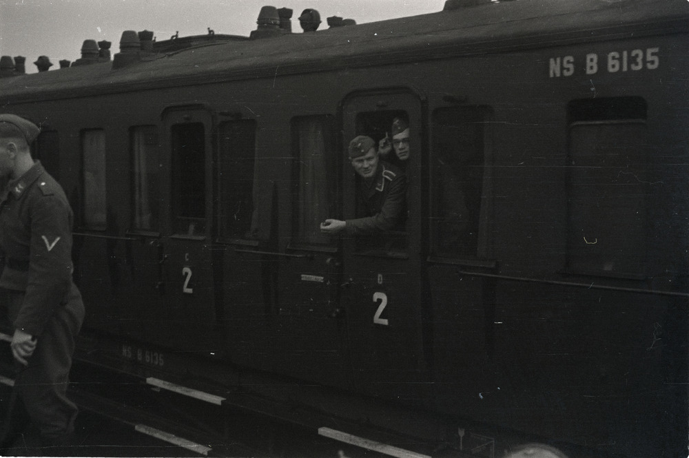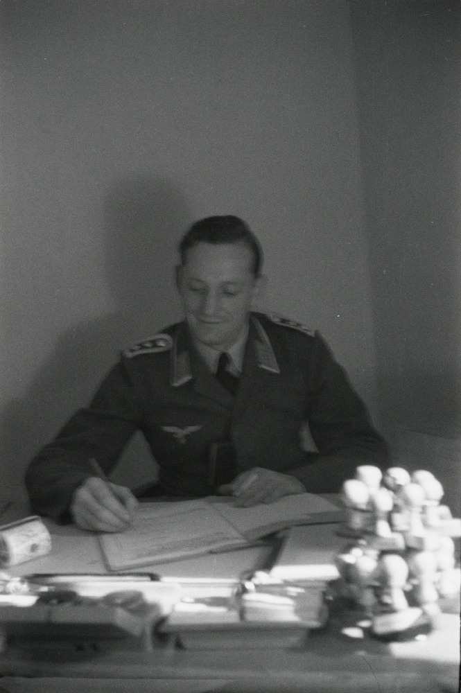 Een Duitse militair is bezig met schrijfwerk aan een...