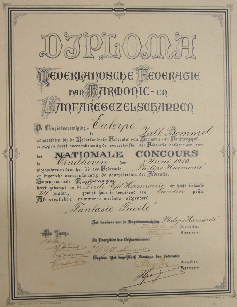 Diploma behaald door Euterpe te Zaltbommel, 2e prijs...