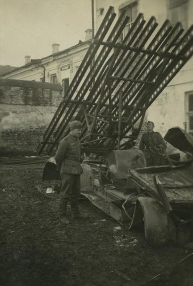2 Duitse militairen bij wrak van Katyusha