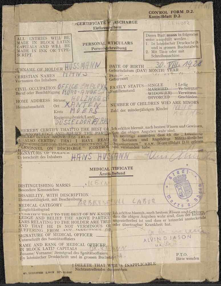 Certificate of discharge/Entlassungsschein nummer op...
