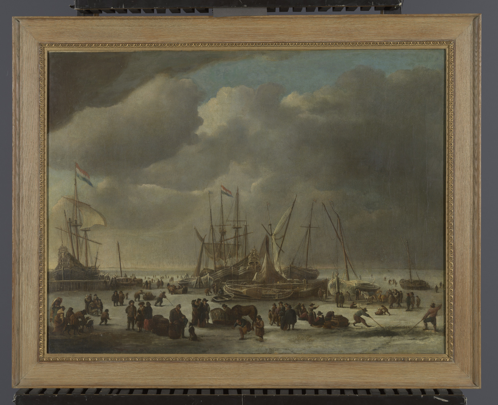 Wintergezicht met schepen vastgelopen in het ijs